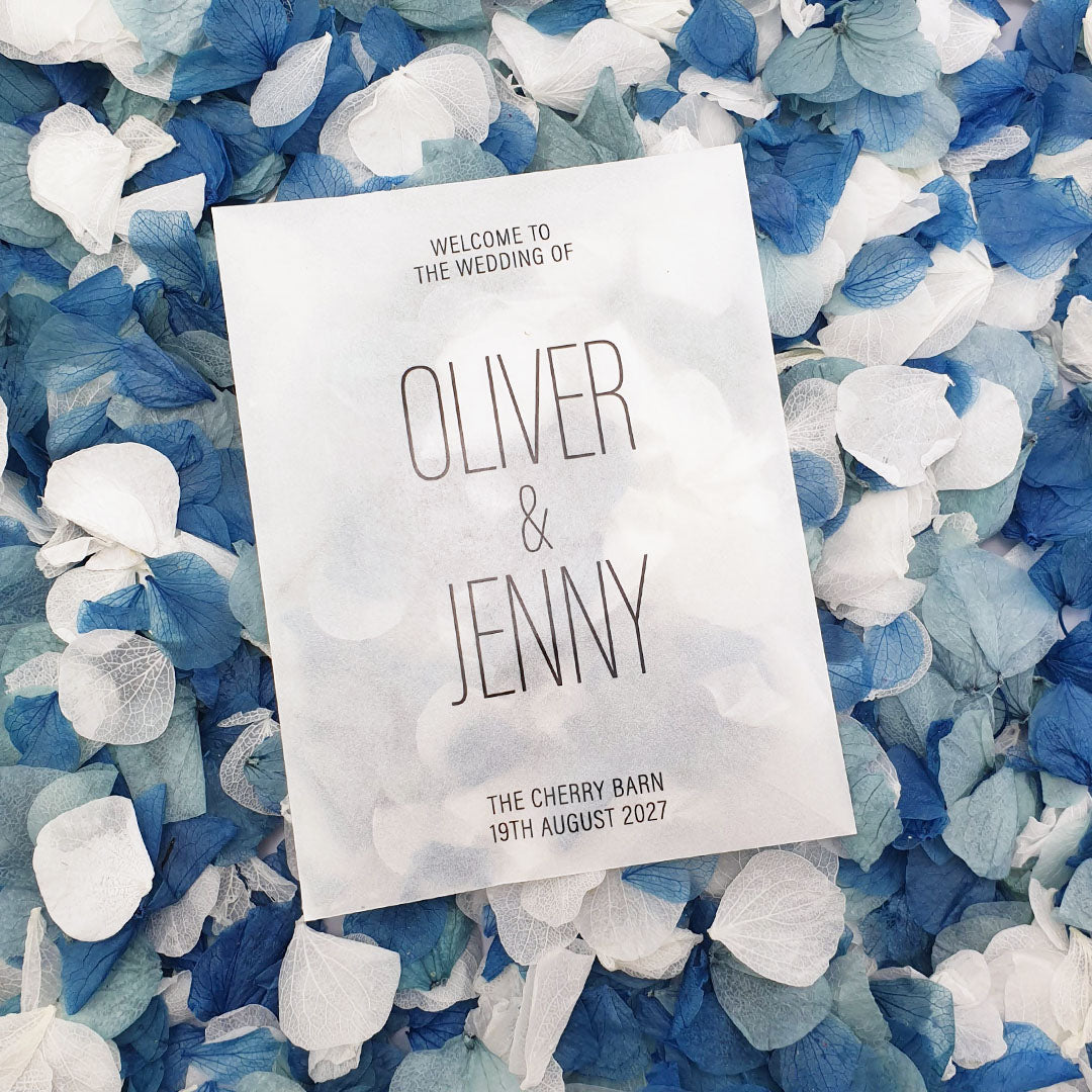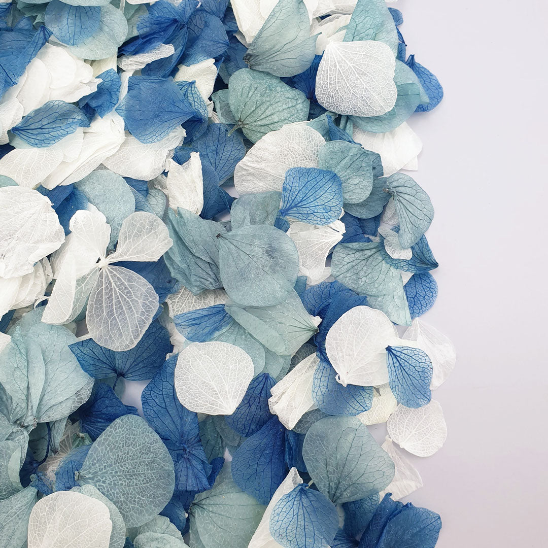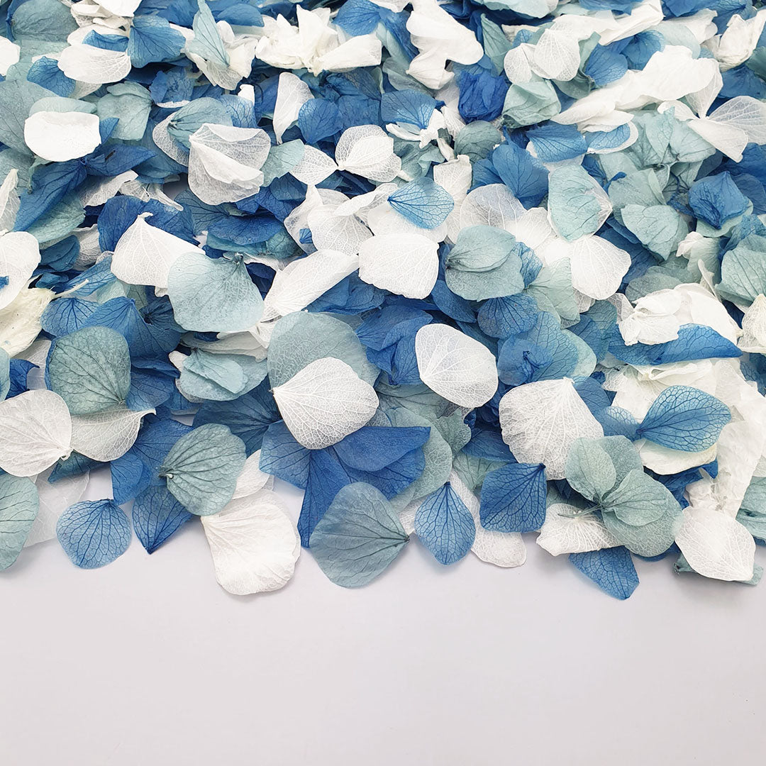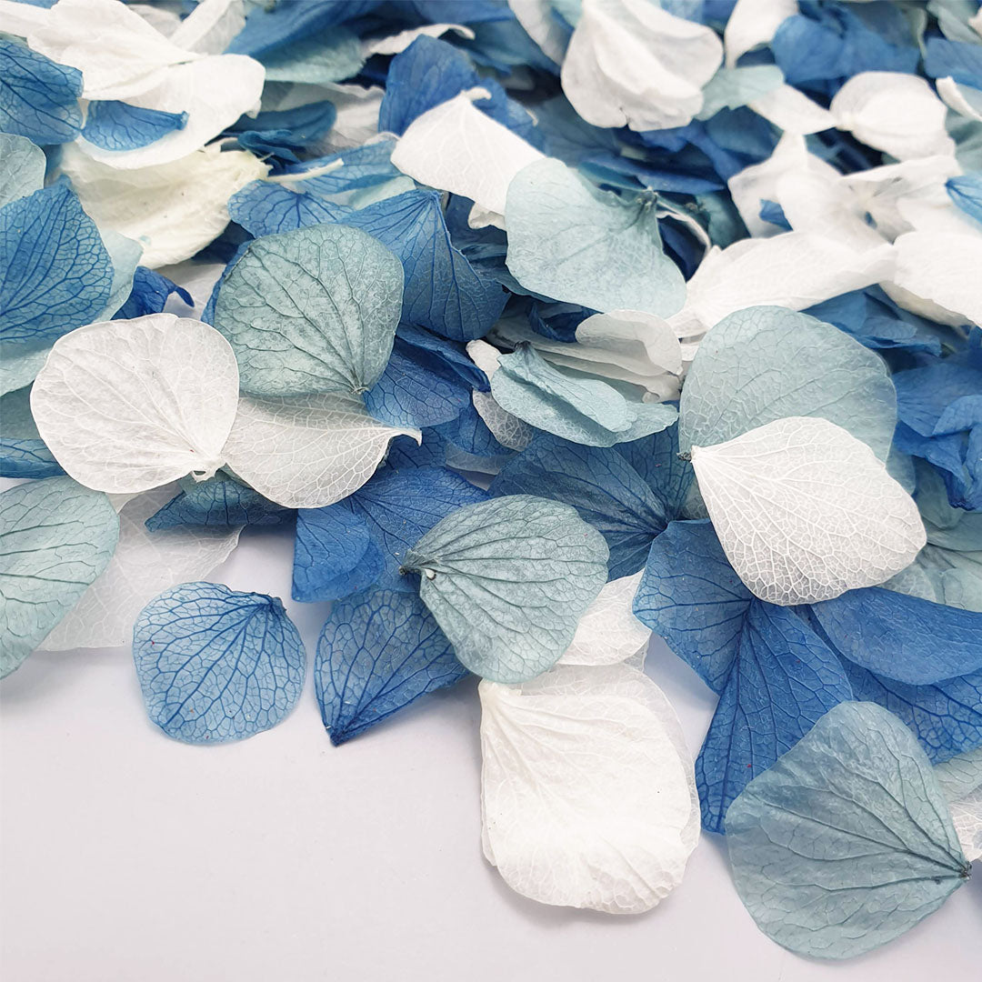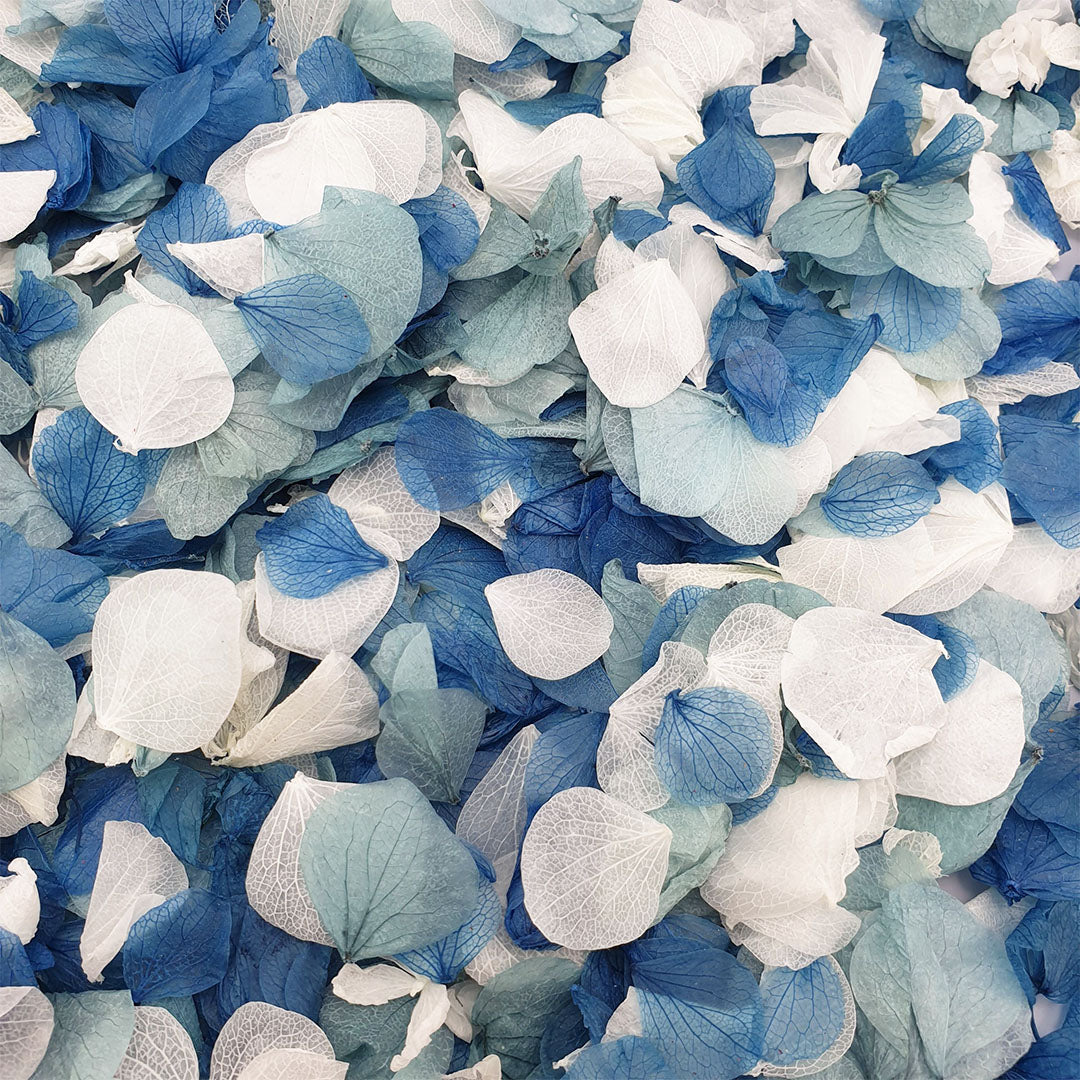 Evoking the dreamy tones of a starry night sky, Blue Moon Confetti features a carefully balanced blend of delicate Snow White and Blue Hydrangea Petals, complemented by a light sprinkling of bold Dark Blue Hydrangea petals. This striking colour palette creates depth, contrast, and a shimmering effect that looks stunning in wedding photography. The hydrangea petals have been treated to ensure longevity and help preserve their vibrant colour, while remaining 100% natural, biodegradable, and eco-friendly, making them suitable for a wide range of wedding venues.