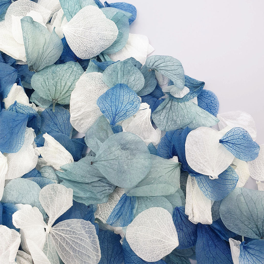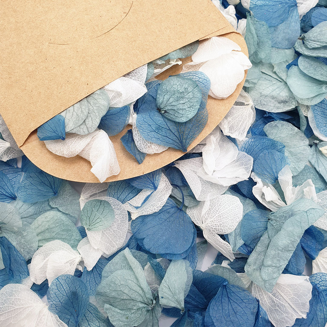 Please note that the dark blue hydrangea petals have been specially treated to achieve their vivid colour. This process leaves some natural oils within the petals, which makes them unsuitable for use with Glassine Confetti Packets or Kraft Brown Confetti Packets, as these wood-pulp packets are highly absorbent. However, they are fully compatible with the rest of our wide range of confetti packaging options, allowing you to present them beautifully on your big day.