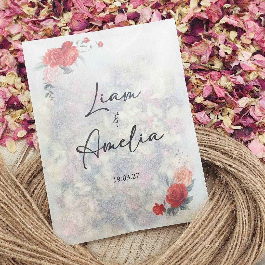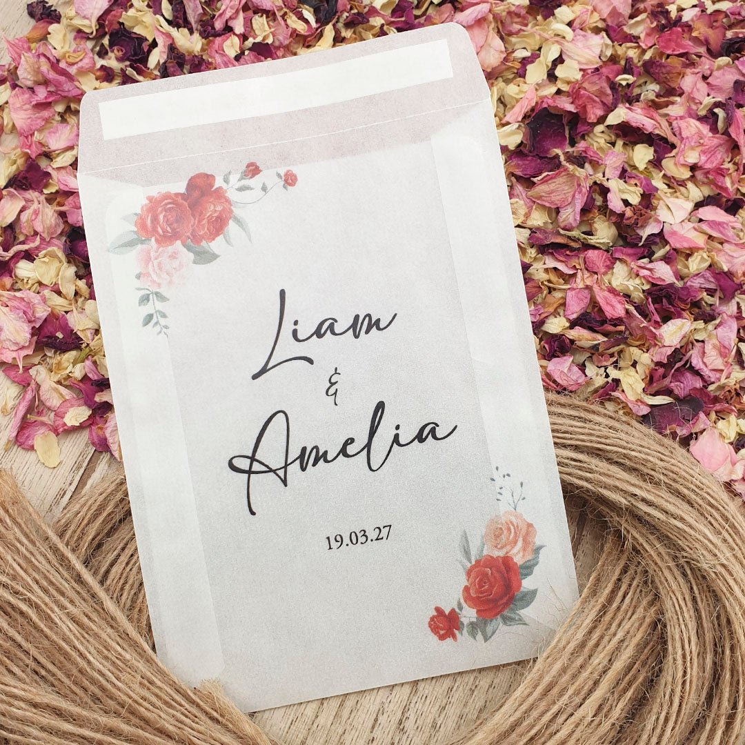 Personalise your confetti packets with your names & wedding date then fill with your chosen confetti to beautifully complement the colour and theme of your Wedding Day!