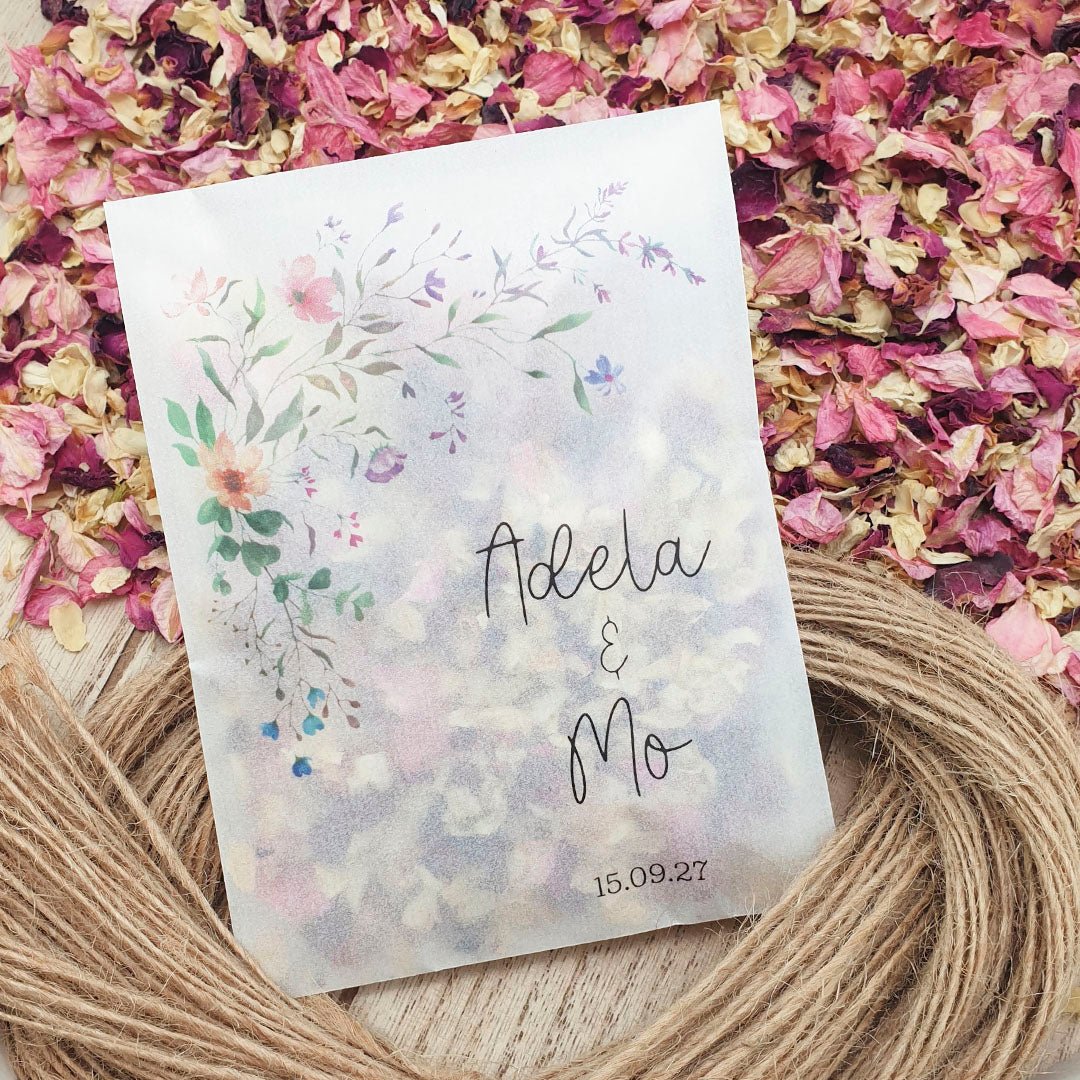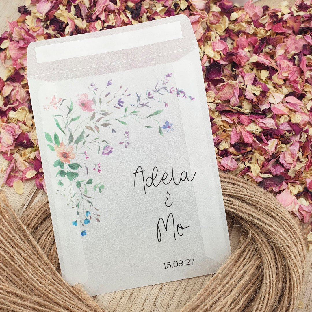 Personalise your confetti packets with your names & wedding date then fill with your chosen confetti to beautifully complement the colour and theme of your Wedding Day!