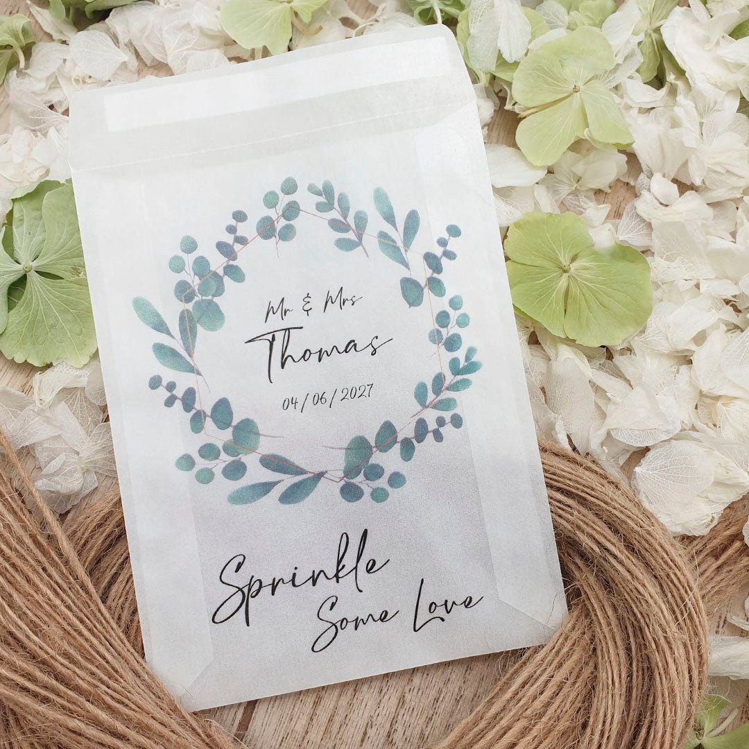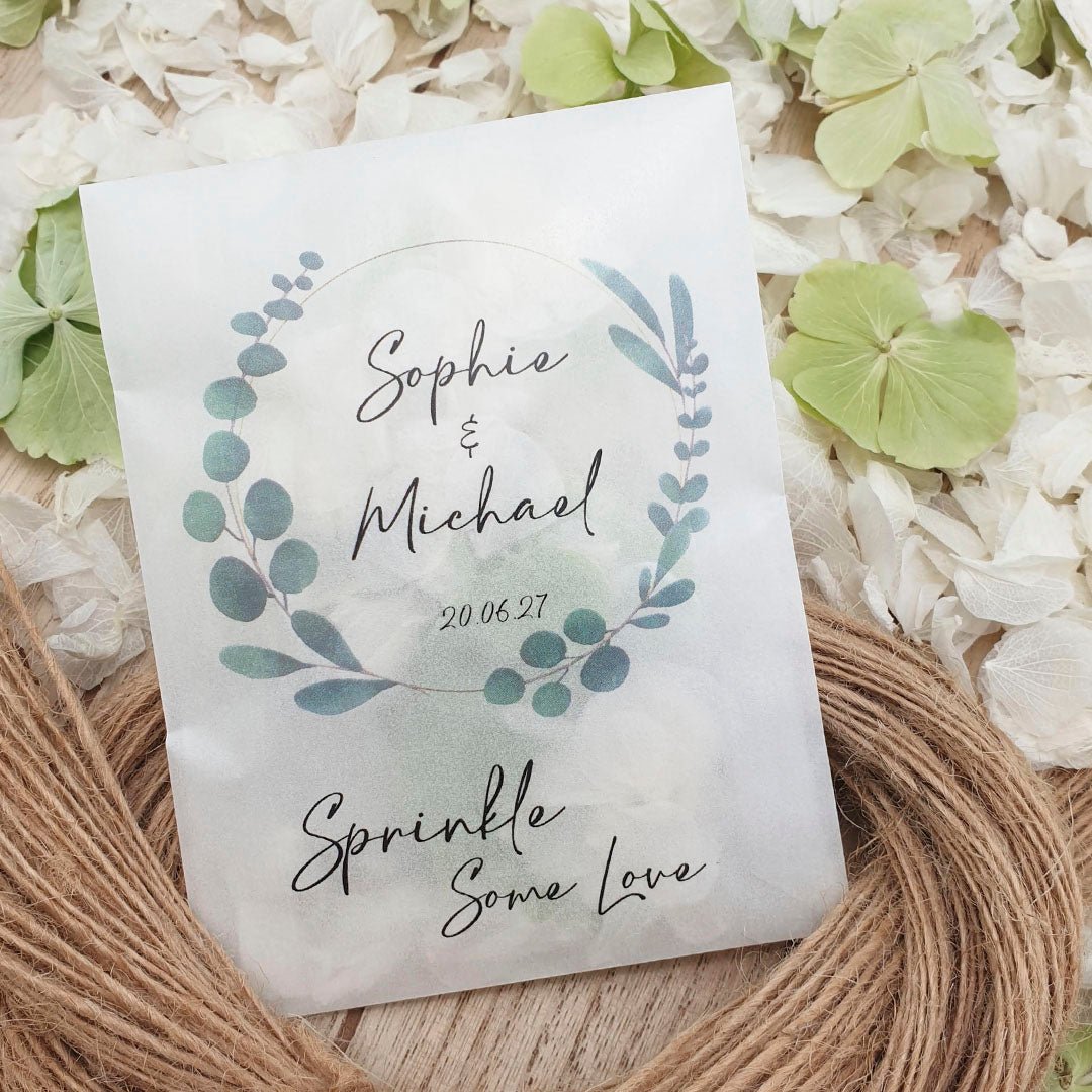 Personalisieren Sie Ihre Konfetti-Päckchen mit Ihren Namen und Ihrem Hochzeitsdatum und füllen Sie sie dann mit dem von Ihnen gewählten Konfetti , um die Farbe und das Thema Ihres Hochzeitstages wunderbar zu ergänzen!