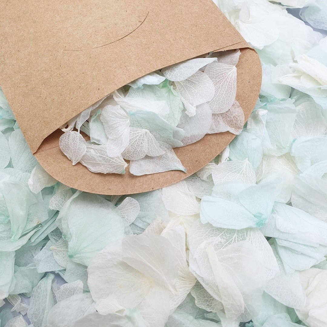 Bei mittelgroßem/großem Blütenblattkonfetti gehen wir davon aus, dass 1 Liter Konfetti 8–12 lose Handvoll ergibt und etwa 10–15 Päckchen füllt.