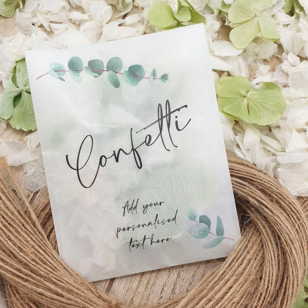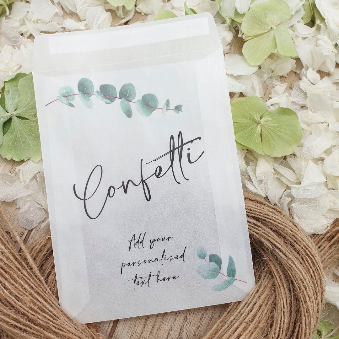 Personalisieren Sie Ihre Konfetti-Päckchen mit Ihren Namen und Ihrem Hochzeitsdatum und füllen Sie sie dann mit dem von Ihnen gewählten Konfetti , um die Farbe und das Thema Ihres Hochzeitstages wunderbar zu ergänzen!