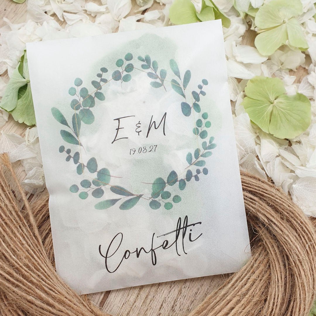 Personalisieren Sie Ihre Konfetti-Päckchen mit Ihren Namen und Ihrem Hochzeitsdatum und füllen Sie sie dann mit dem von Ihnen gewählten Konfetti , um die Farbe und das Thema Ihres Hochzeitstages wunderbar zu ergänzen!