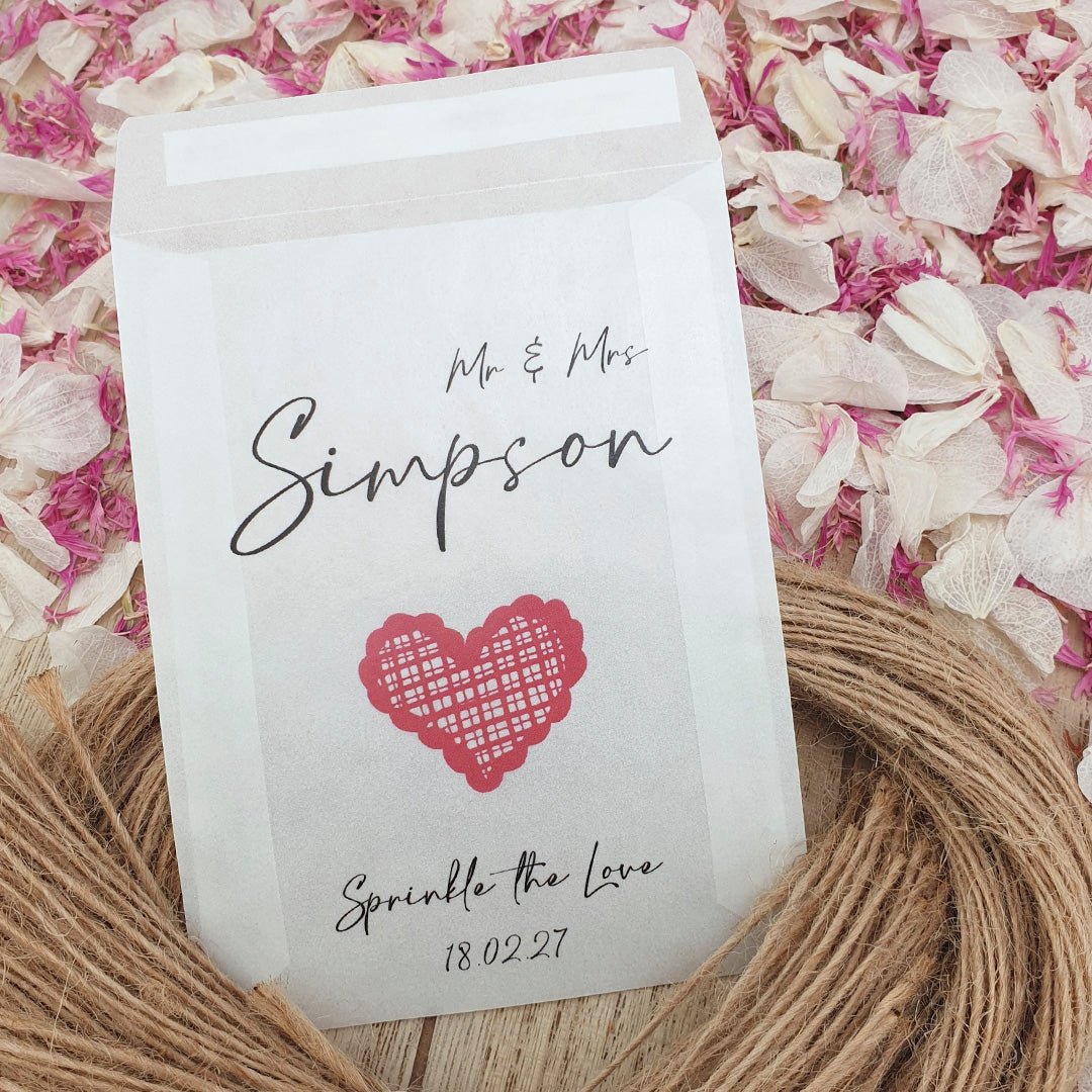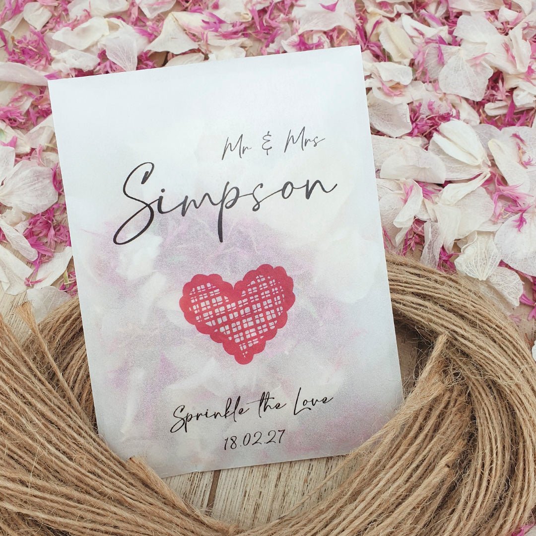 Personalisieren Sie Ihre Konfetti-Päckchen mit Ihren Namen und Ihrem Hochzeitsdatum und füllen Sie sie dann mit dem von Ihnen gewählten Konfetti , um die Farbe und das Thema Ihres Hochzeitstages wunderbar zu ergänzen!