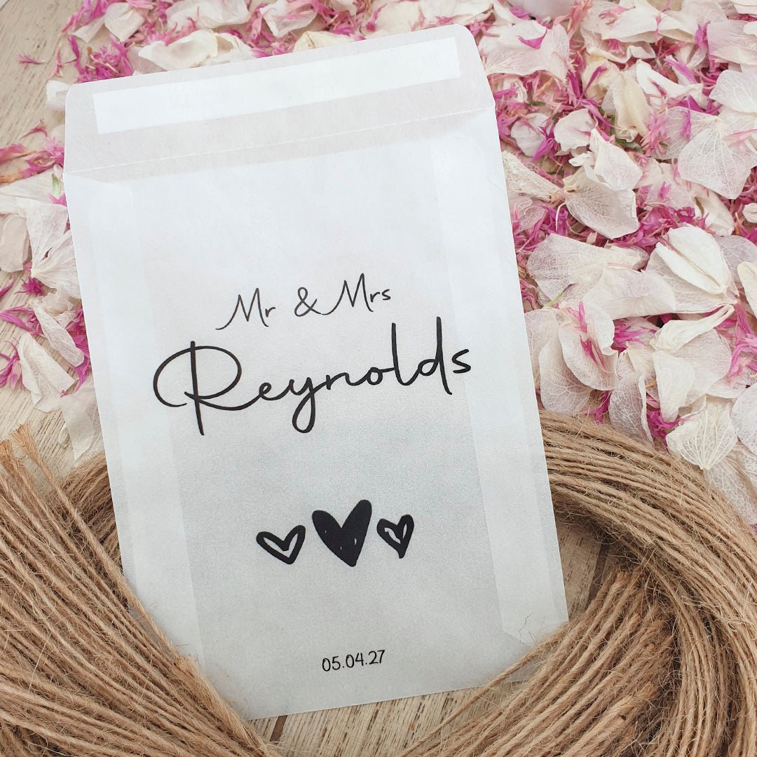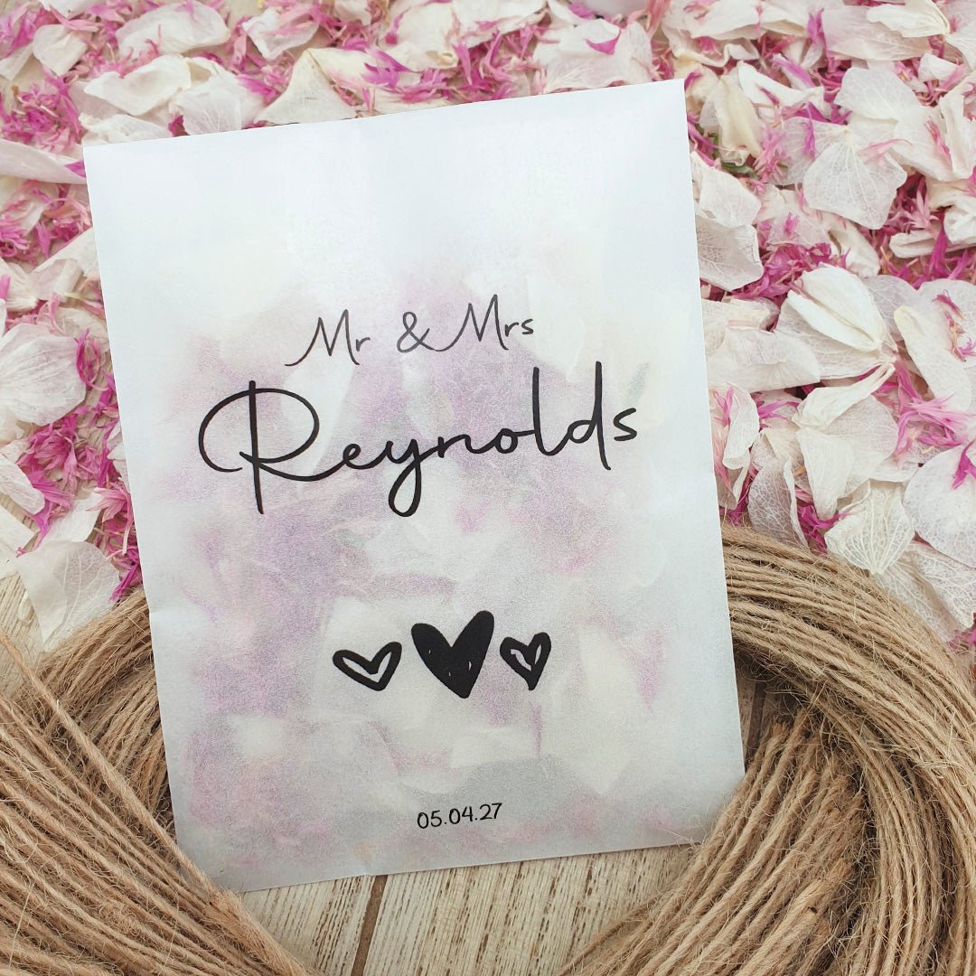 Personalisieren Sie Ihre Konfetti-Päckchen mit Ihren Namen und Ihrem Hochzeitsdatum und füllen Sie sie dann mit dem von Ihnen gewählten Konfetti , um die Farbe und das Thema Ihres Hochzeitstages wunderbar zu ergänzen!