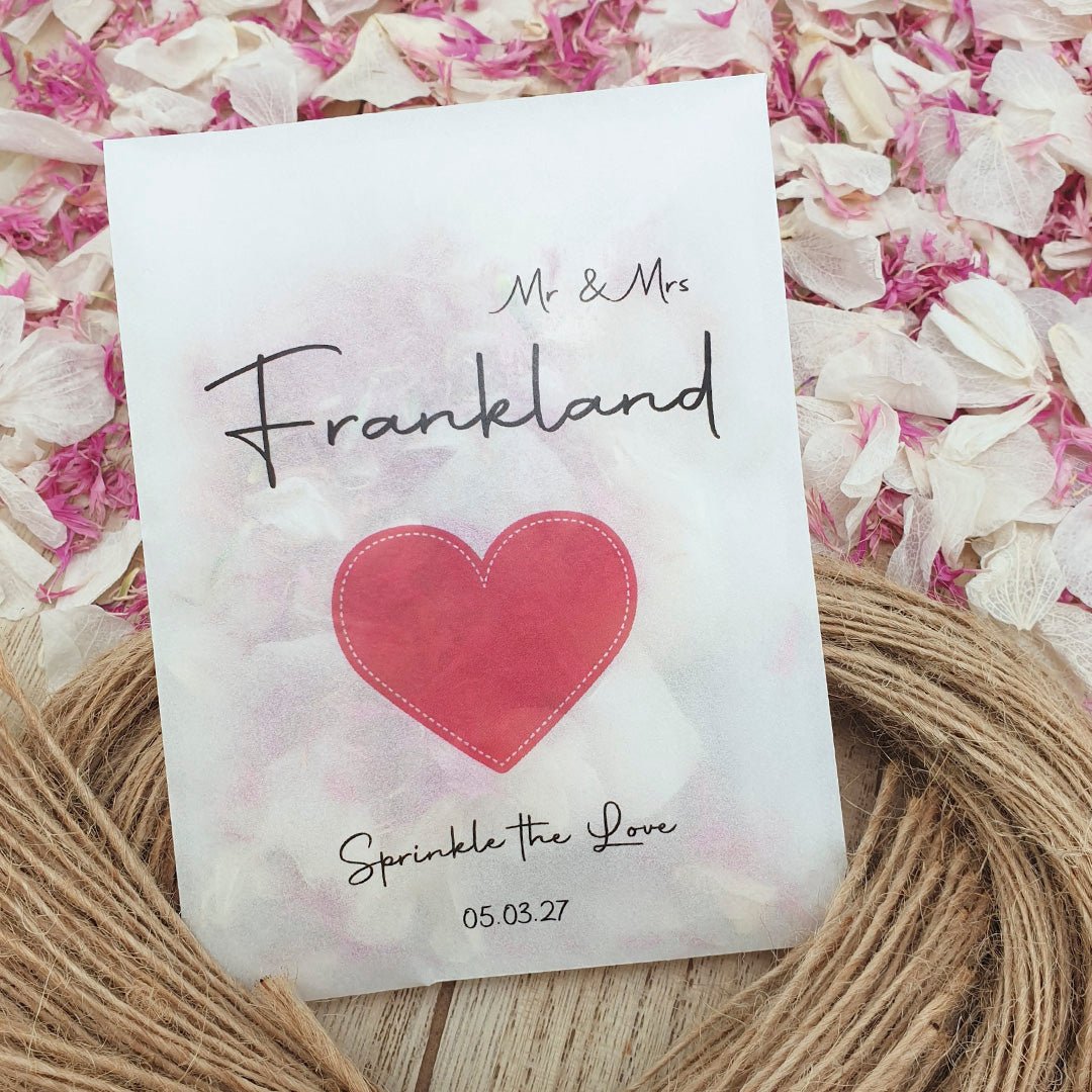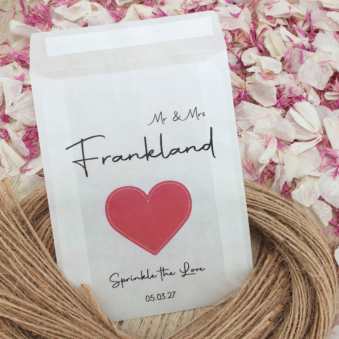 Personalisieren Sie Ihre Konfetti-Päckchen mit Ihren Namen und Ihrem Hochzeitsdatum und füllen Sie sie dann mit dem von Ihnen gewählten Konfetti , um die Farbe und das Thema Ihres Hochzeitstages wunderbar zu ergänzen!