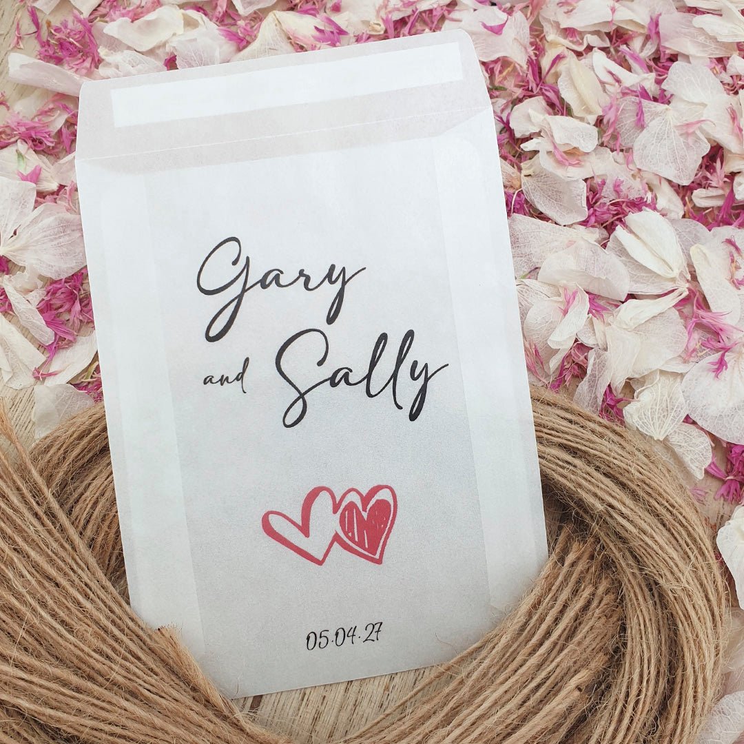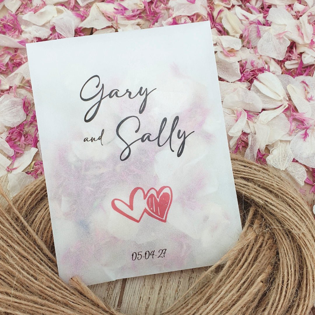 Personalisieren Sie Ihre Konfetti-Päckchen mit Ihren Namen und Ihrem Hochzeitsdatum und füllen Sie sie dann mit dem von Ihnen gewählten Konfetti , um die Farbe und das Thema Ihres Hochzeitstages wunderbar zu ergänzen!