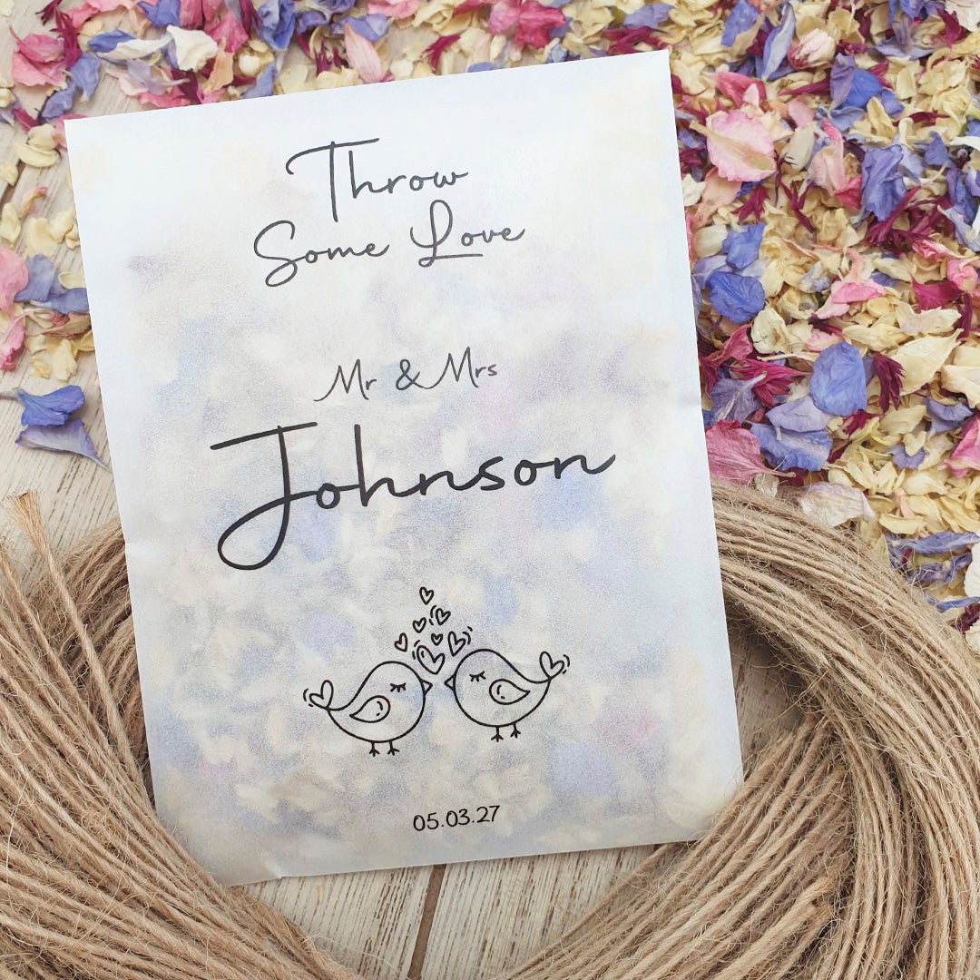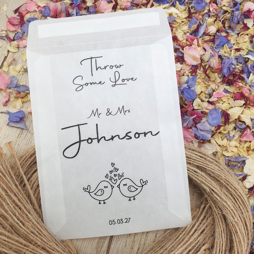 Personalisieren Sie Ihre Konfetti-Päckchen mit Ihren Namen und Ihrem Hochzeitsdatum und füllen Sie sie dann mit dem von Ihnen gewählten Konfetti , um die Farbe und das Thema Ihres Hochzeitstages wunderbar zu ergänzen!