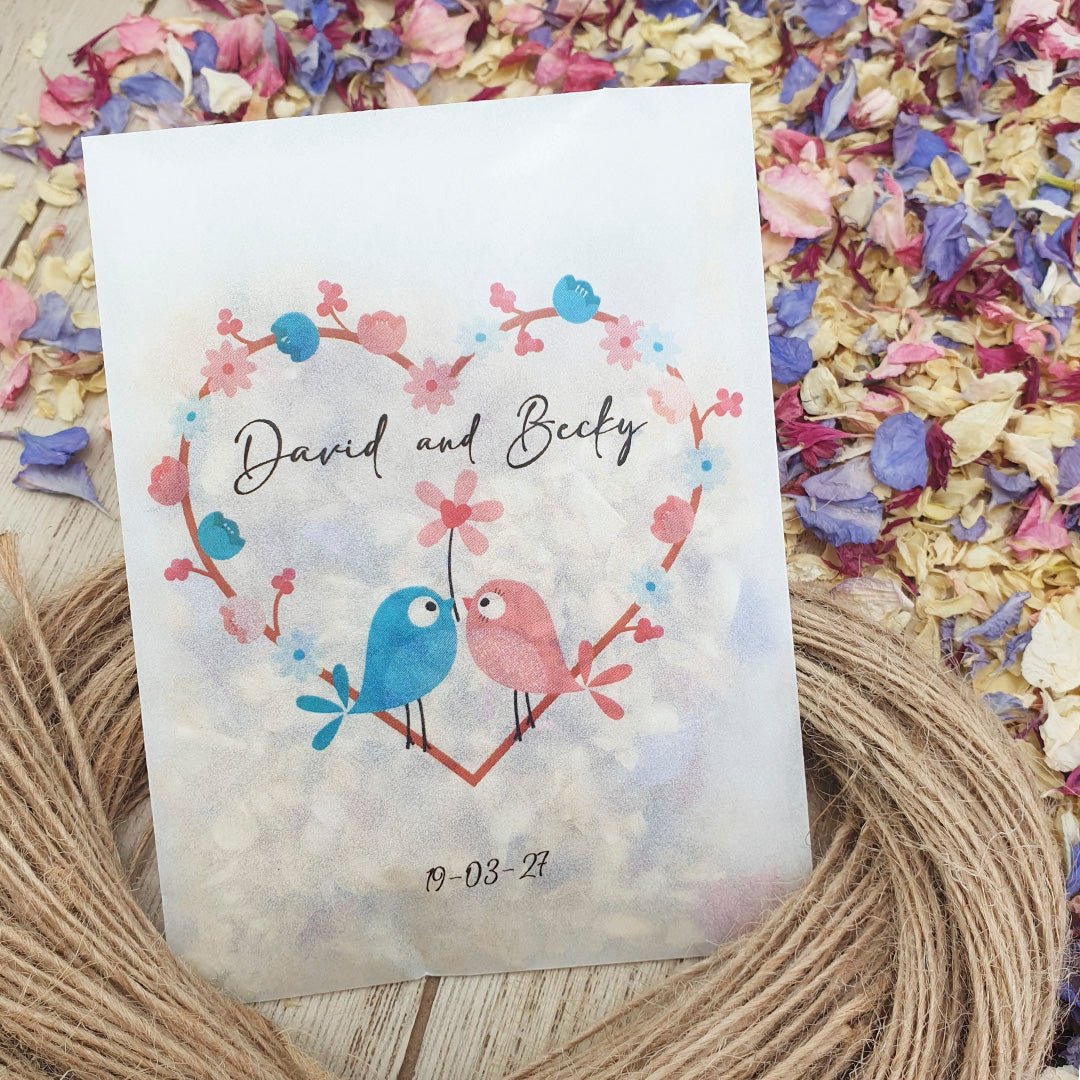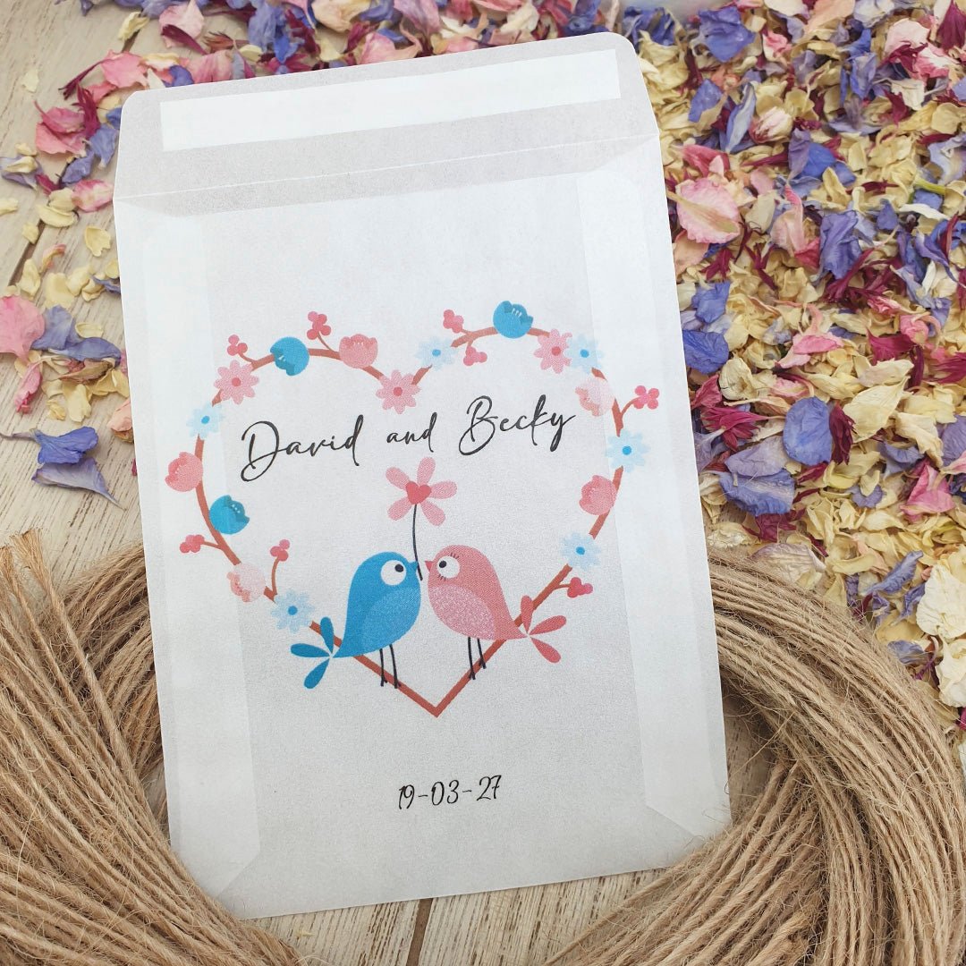Personalisieren Sie Ihre Konfetti-Päckchen mit Ihren Namen und Ihrem Hochzeitsdatum und füllen Sie sie dann mit dem von Ihnen gewählten Konfetti , um die Farbe und das Thema Ihres Hochzeitstages wunderbar zu ergänzen!