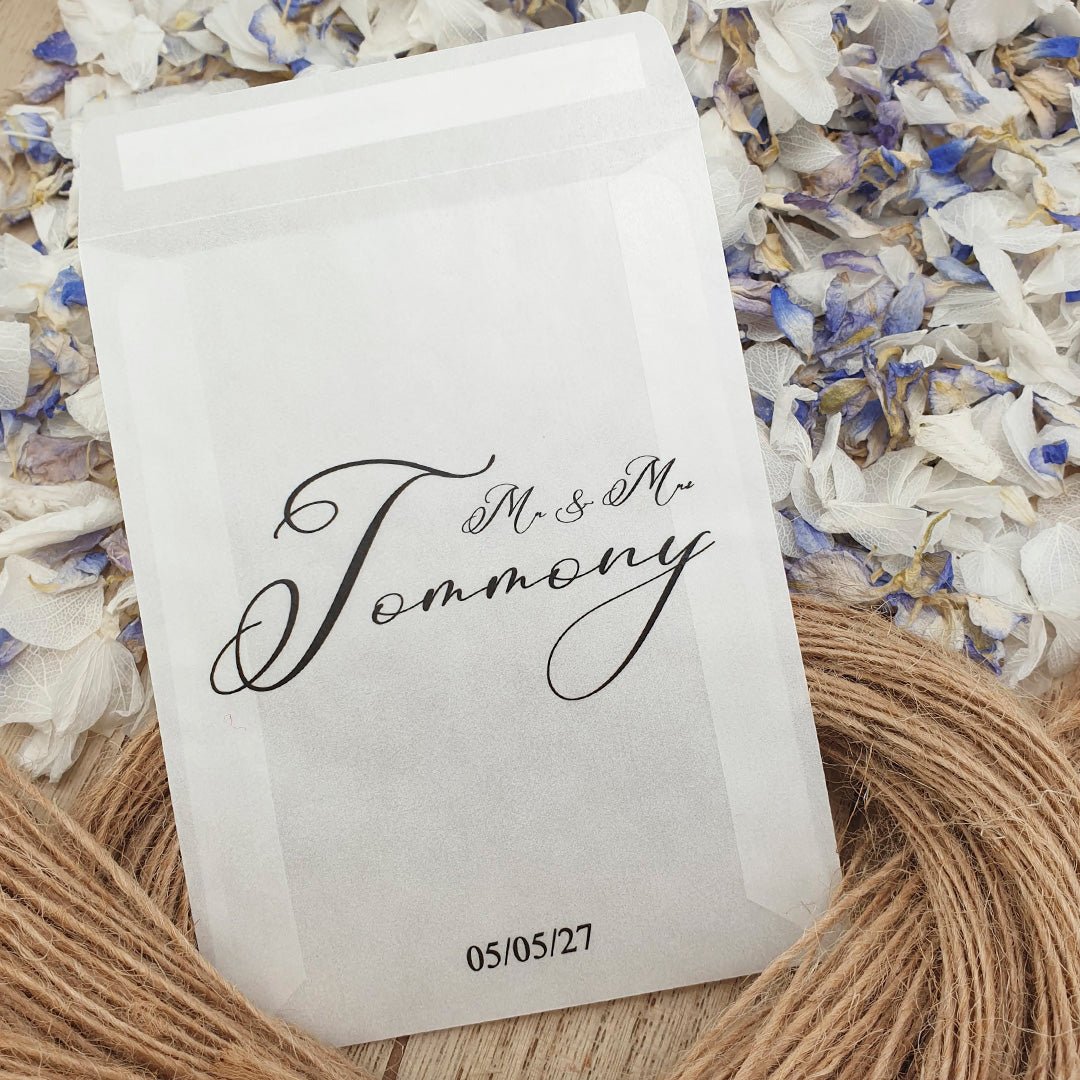 Personalisieren Sie Ihre Konfetti-Päckchen mit Ihrem Ehenamen und Hochzeitsdatum und füllen Sie sie mit dem von Ihnen gewählten Konfetti Ergänzen Sie wunderbar die Farbe und das Thema Ihres Hochzeitstags!