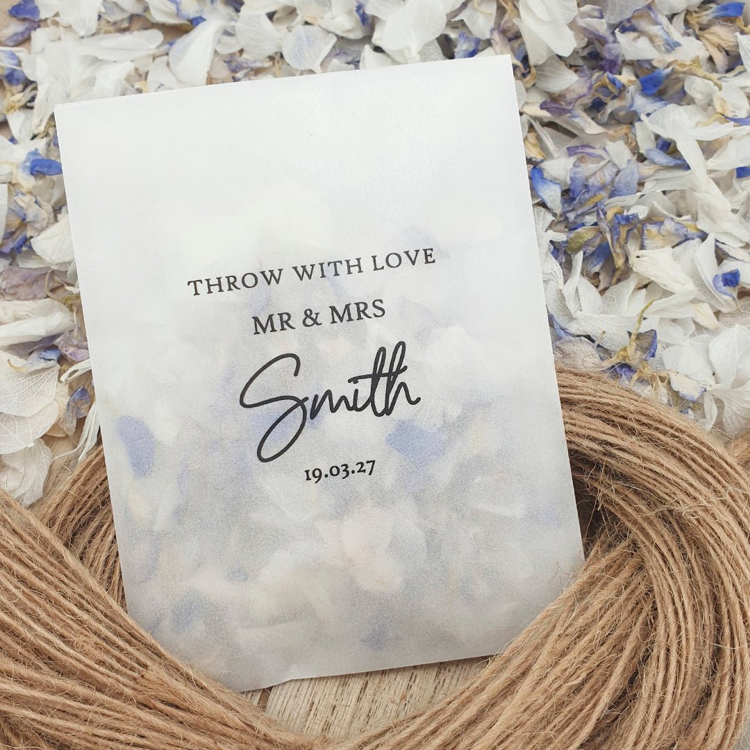 Personalisieren Sie Ihre Konfetti-Päckchen mit Ihrem verheirateten Nachnamen und Ihrem Hochzeitsdatum und füllen Sie sie mit dem von Ihnen gewählten Konfetti, um die Farbe und das Thema Ihres Hochzeitstages wunderbar zu ergänzen!