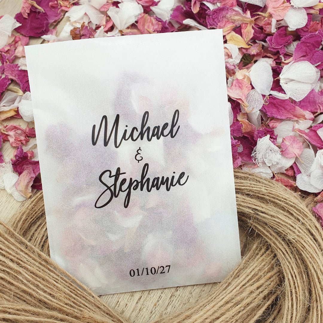 Personalisieren Sie Ihre Konfetti-Päckchen mit Ihren Namen und Ihrem Hochzeitsdatum und füllen Sie sie mit dem von Ihnen gewählten Konfetti Ergänzen Sie wunderbar die Farbe und das Thema Ihres Hochzeitstags!
