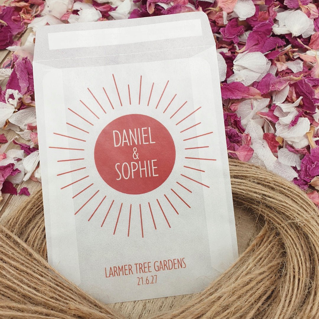 Personalisieren Sie Ihre Konfetti-Päckchen mit Ihren Namen und Ihrem Hochzeitsdatum und füllen Sie sie mit dem von Ihnen gewählten Konfetti Ergänzen Sie wunderbar die Farbe und das Thema Ihres Hochzeitstags!