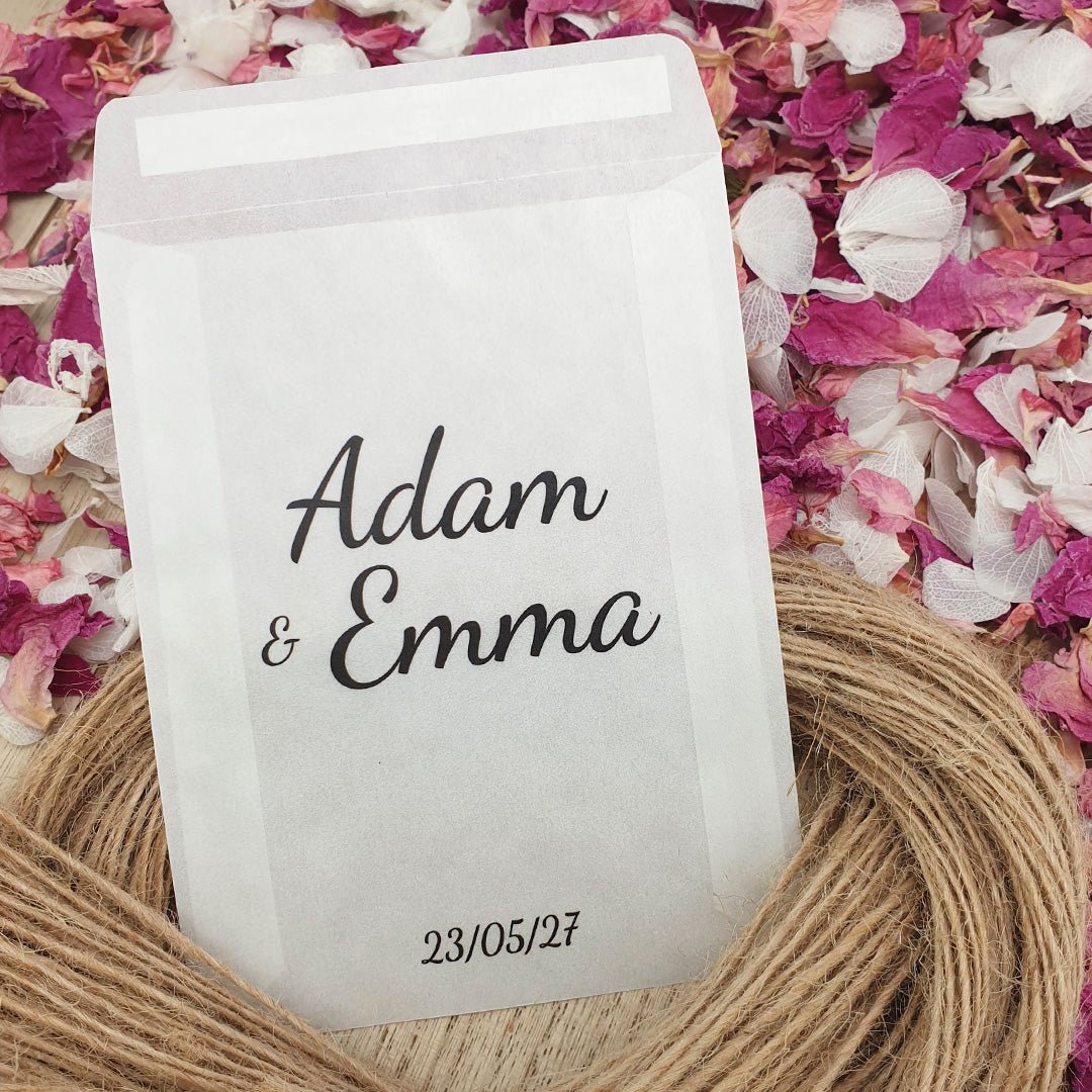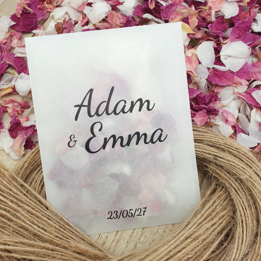 Personalisieren Sie Ihre Konfetti-Päckchen mit Ihren Namen und Ihrem Hochzeitsdatum und füllen Sie sie mit dem von Ihnen gewählten Konfetti Ergänzen Sie wunderbar die Farbe und das Thema Ihres Hochzeitstags!