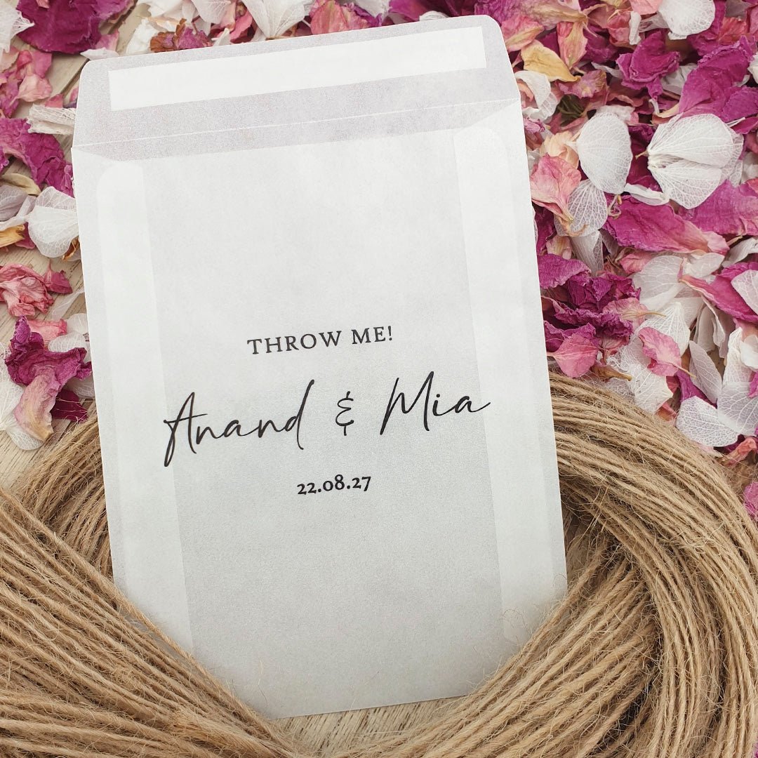 Personalisieren Sie Ihre Konfetti-Päckchen mit Ihren Namen und Ihrem Hochzeitsdatum und füllen Sie sie mit dem von Ihnen gewählten Konfetti Ergänzen Sie wunderbar die Farbe und das Thema Ihres Hochzeitstags!