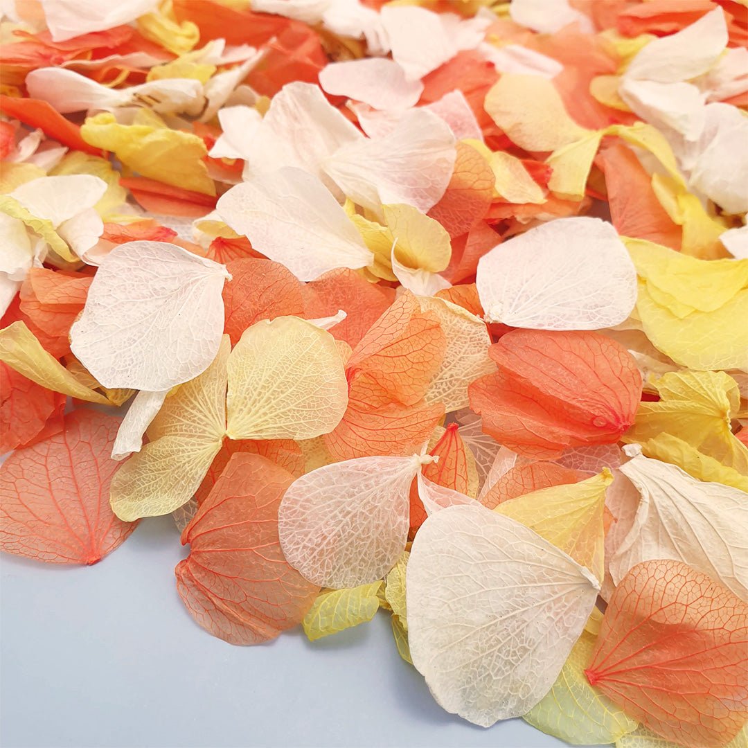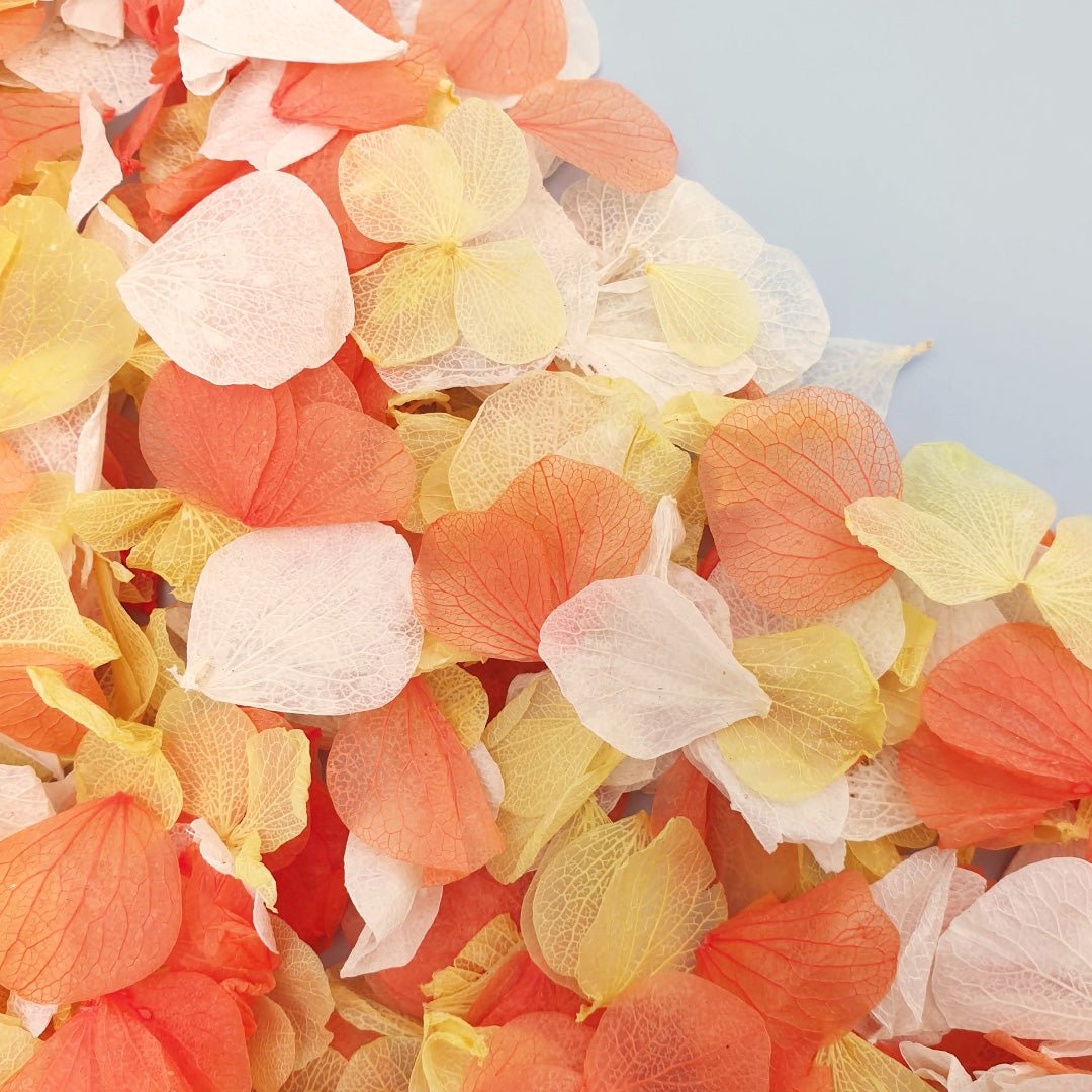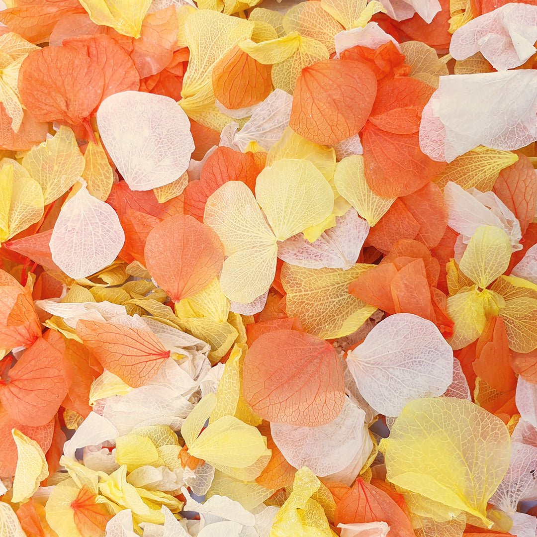Wir lieben einfach diese üppige Mischung aus unseren klassischen Vintage-Elfenbein-Hortensienblütenblättern, dunkelrosa Hortensienblütenblättern und einer leichten Prise kräftig orangefarbener Hortensienblütenblätter . Die Hortensienblätter sind zu 100 % natürlich und biologisch abbaubar und wurden behandelt, um unser berühmtes Finish zu erzielen (und beizubehalten). Bitten Sie uns nur nicht, unsere Geheimformel für die Gewährleistung ihrer einzigartigen, herrlich reinen Farbe zu verraten – wir werden es Ihnen niemals verraten!
