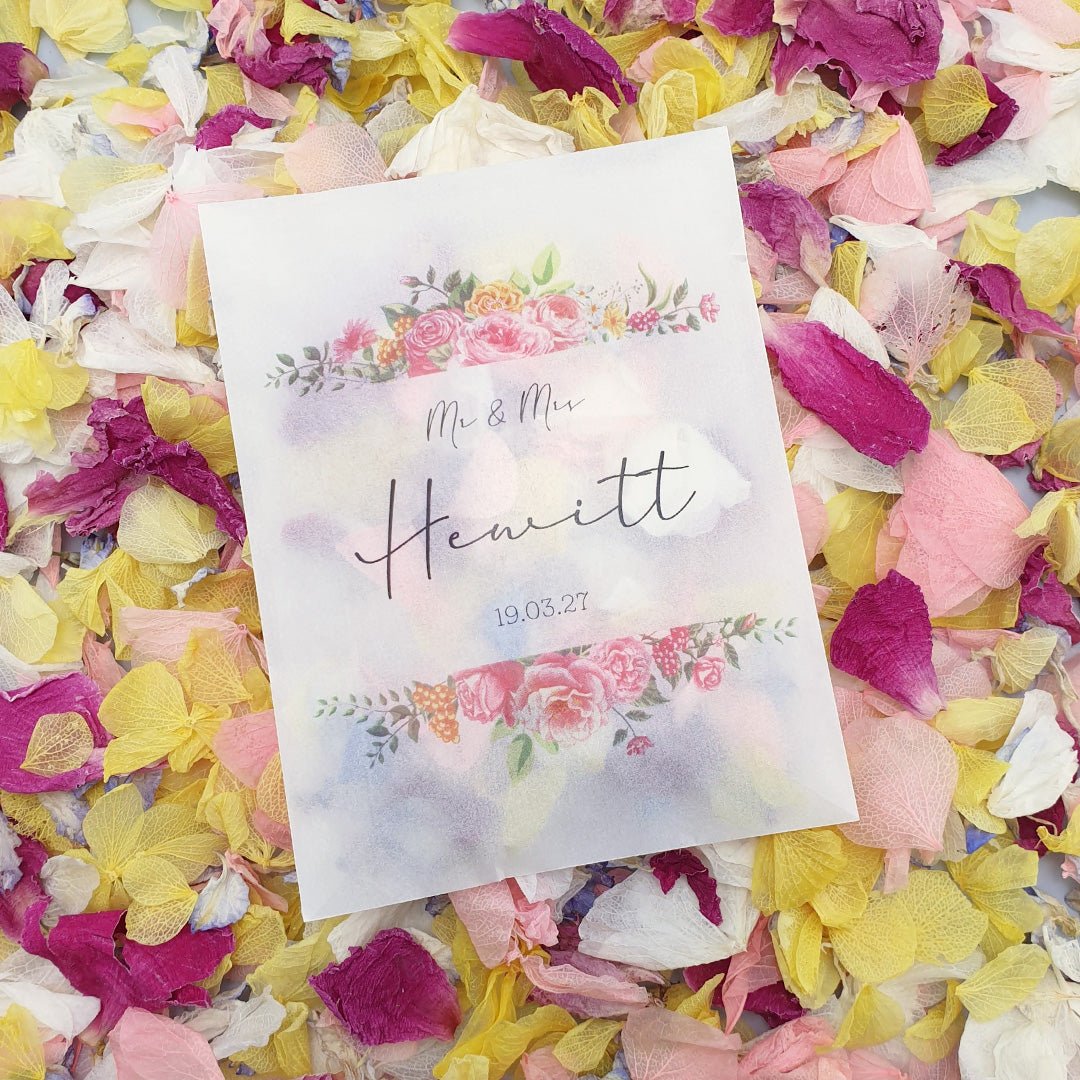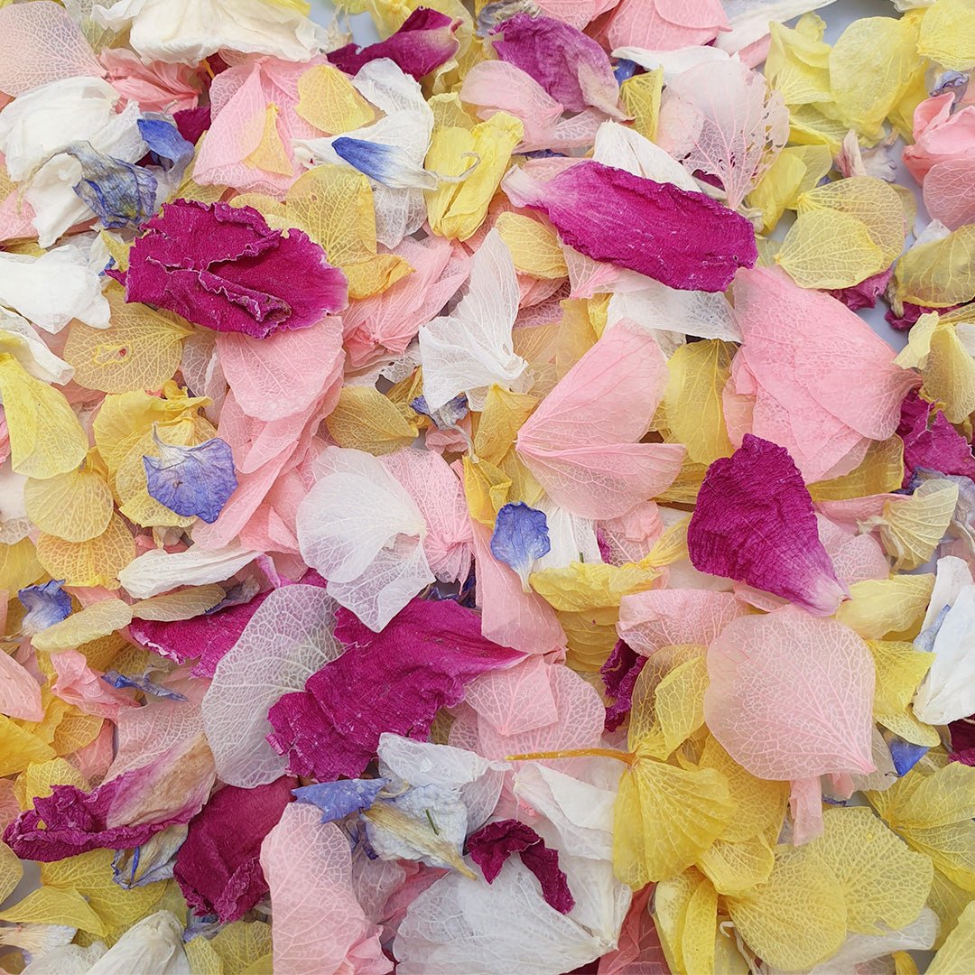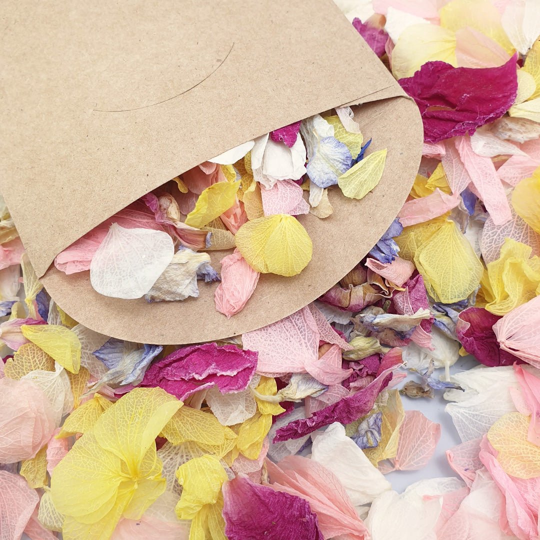Bei mittelgroßem/großem Blütenblattkonfetti gehen wir davon aus, dass 1 Liter Konfetti 8–12 lose Handvoll ergibt und etwa 10–15 Päckchen füllt.