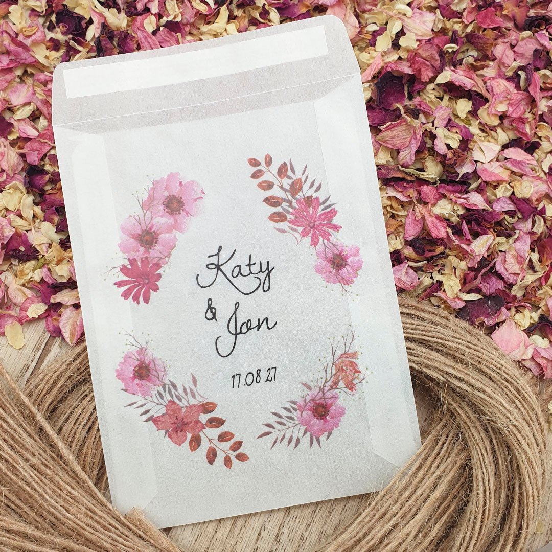 Personalisieren Sie Ihre Konfetti-Päckchen mit Ihren Namen und Ihrem Hochzeitsdatum und füllen Sie sie dann mit dem von Ihnen gewählten Konfetti , um die Farbe und das Thema Ihres Hochzeitstages wunderbar zu ergänzen!