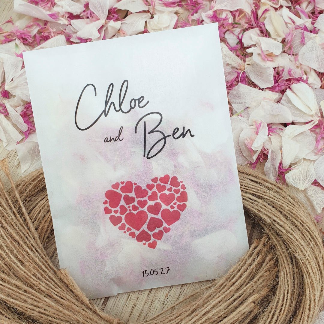 Personalisieren Sie Ihre Konfetti-Päckchen mit Ihren Namen und Ihrem Hochzeitsdatum und füllen Sie sie dann mit dem von Ihnen gewählten Konfetti , um die Farbe und das Thema Ihres Hochzeitstages wunderbar zu ergänzen!