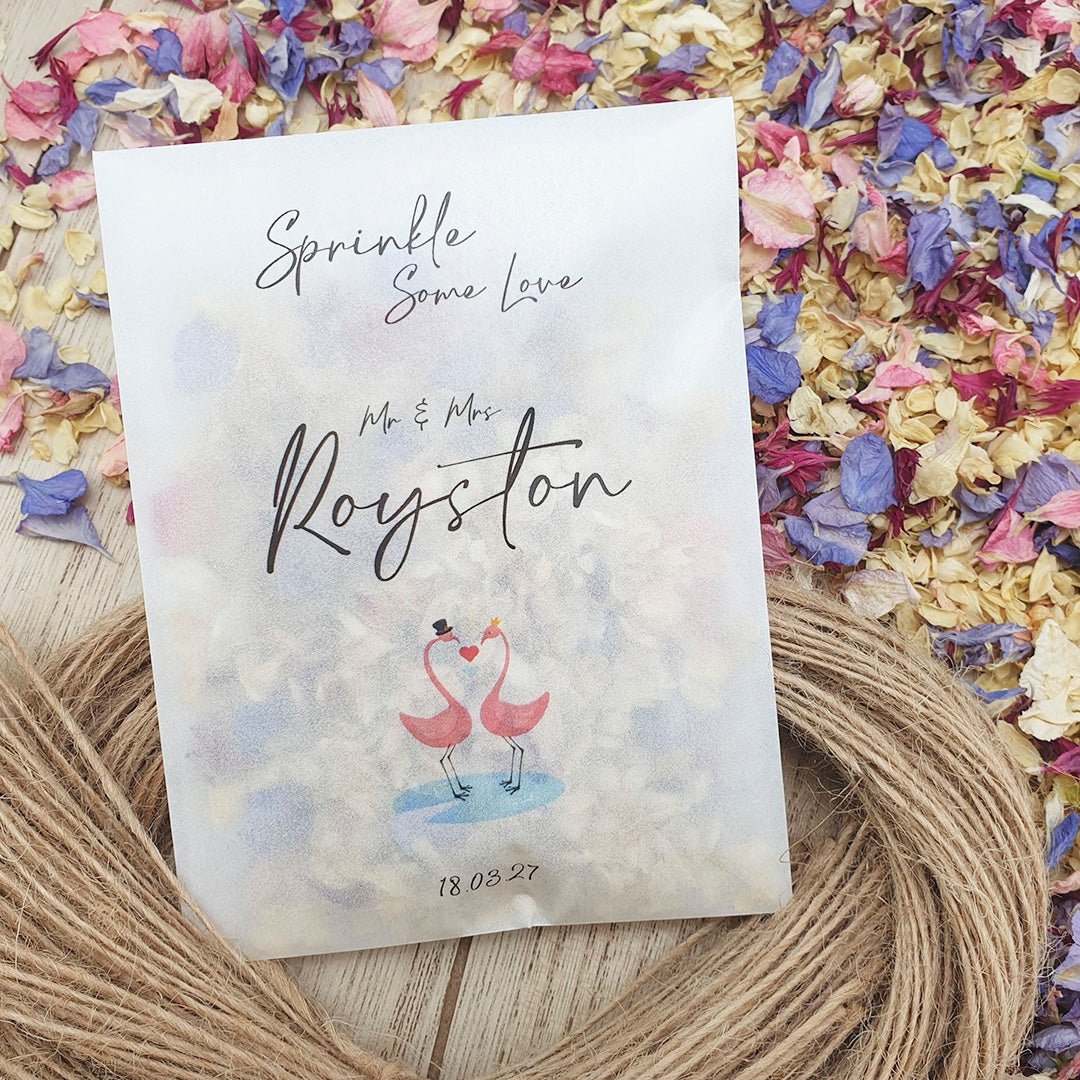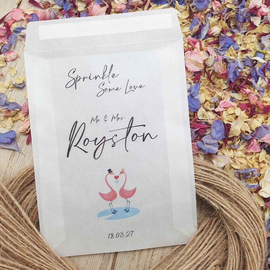 Personalisieren Sie Ihre Konfetti-Päckchen mit Ihren Namen und Ihrem Hochzeitsdatum und füllen Sie sie dann mit dem von Ihnen gewählten Konfetti , um die Farbe und das Thema Ihres Hochzeitstages wunderbar zu ergänzen!