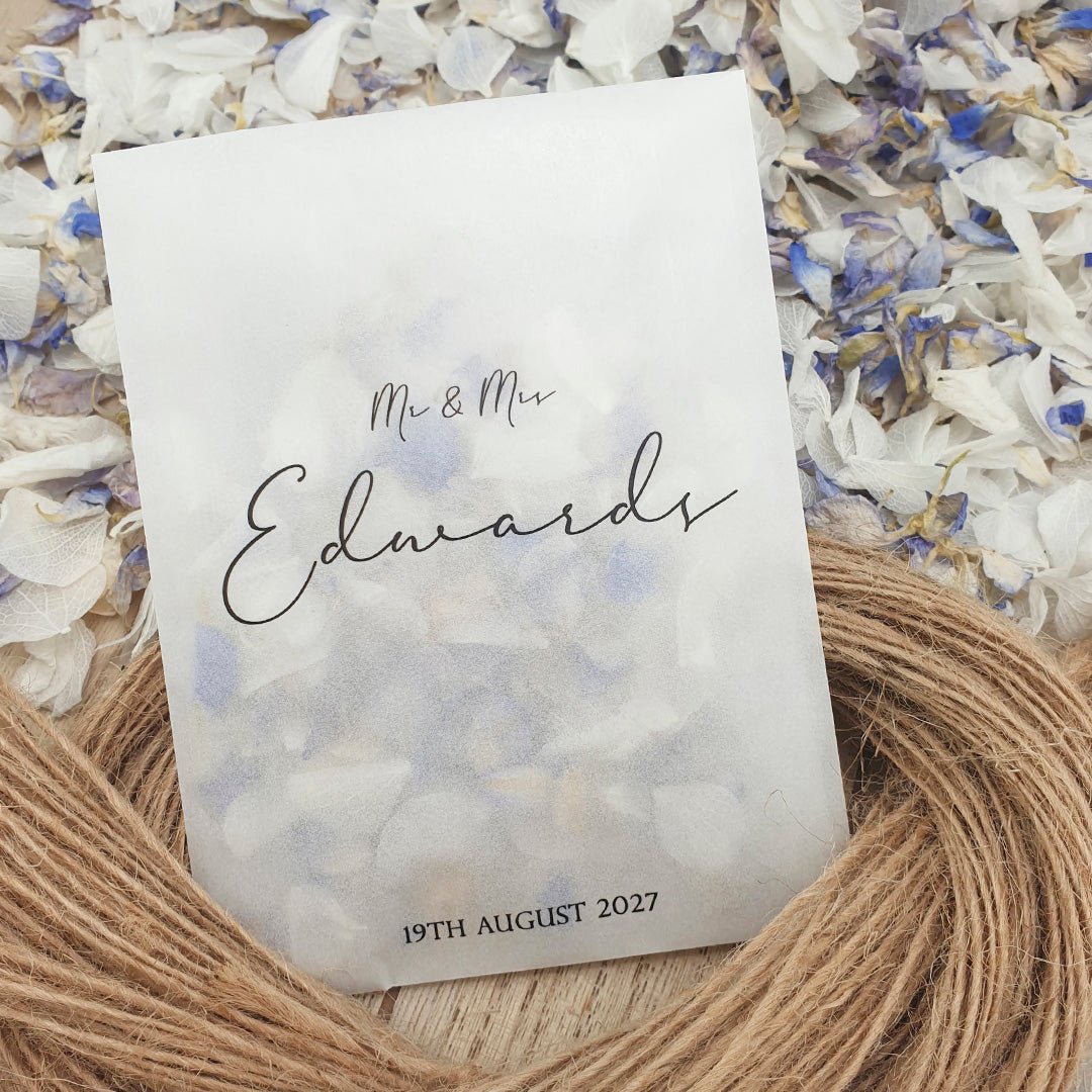 Personalisieren Sie Ihre Konfetti-Päckchen mit Ihrem Ehenamen und Hochzeitsdatum und füllen Sie sie mit dem von Ihnen gewählten Konfetti Ergänzen Sie wunderbar die Farbe und das Thema Ihres Hochzeitstags!