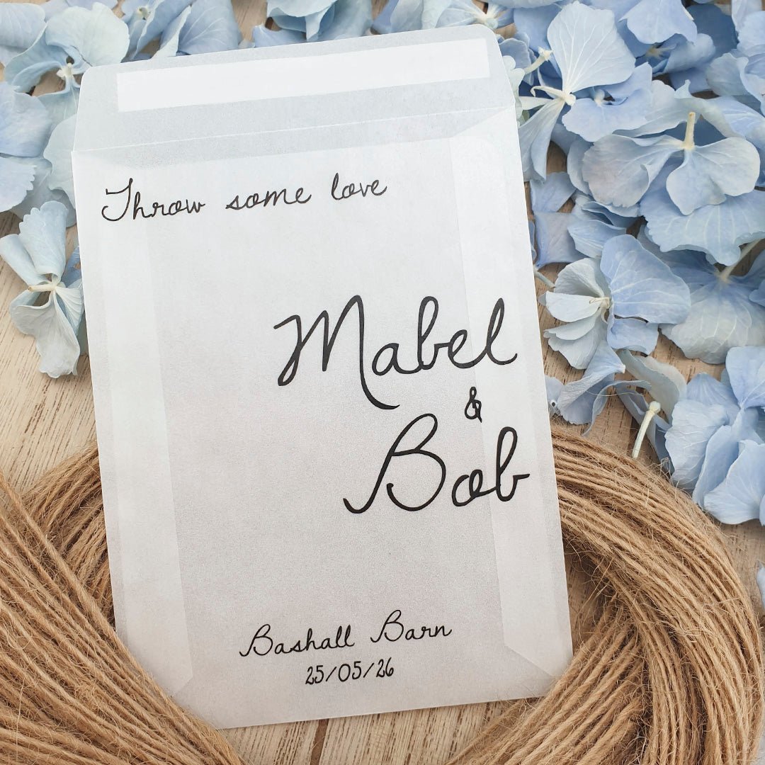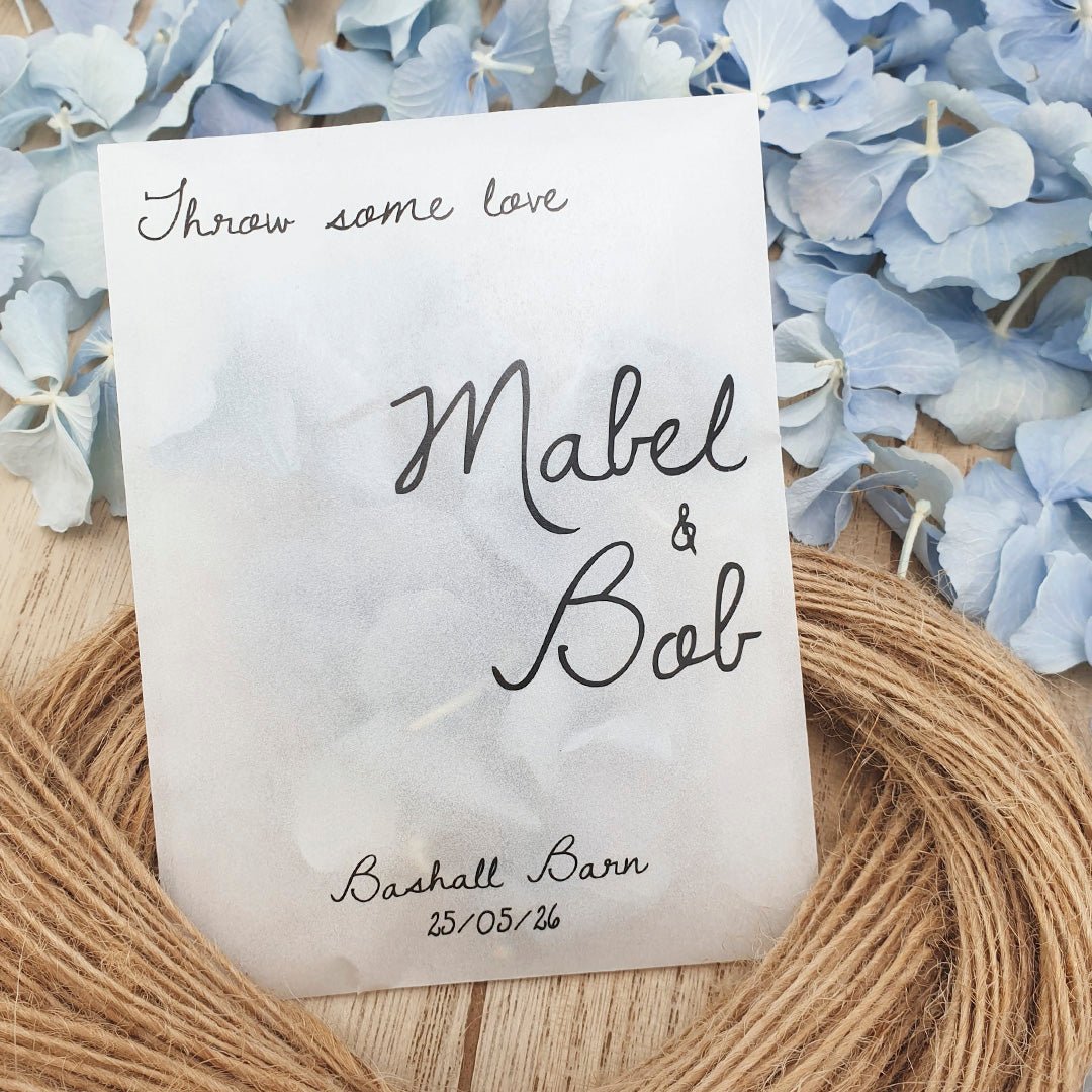 Personalisieren Sie Ihre Konfetti-Päckchen mit Ihren Namen, Ihrem Hochzeitsdatum und Ihrem Hochzeitsort und füllen Sie sie mit dem von Ihnen gewählten Konfetti Ergänzen Sie wunderbar die Farbe und das Thema Ihres Hochzeitstags!