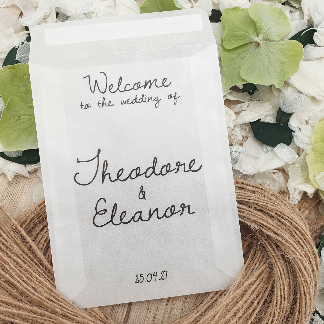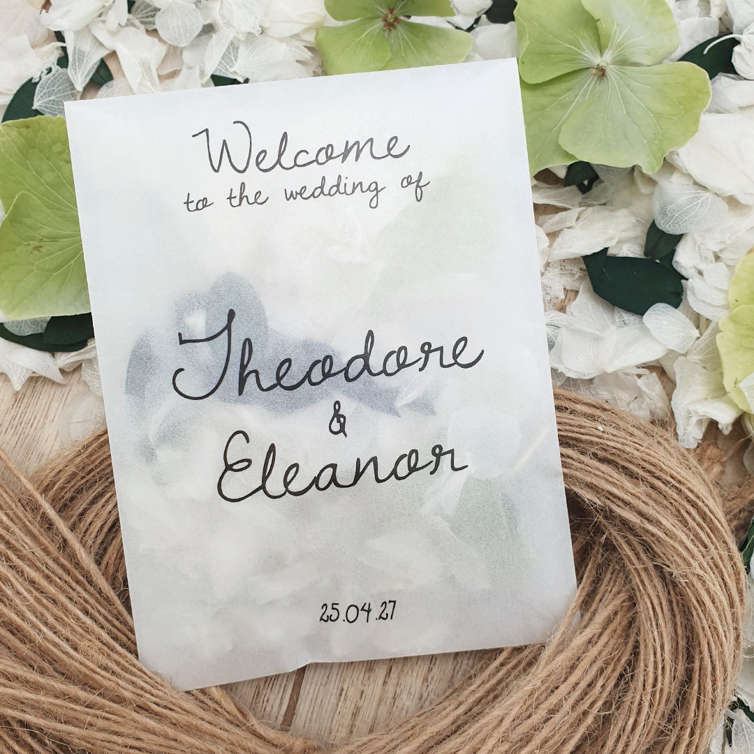 Personalisieren Sie Ihre Konfetti-Päckchen mit Ihren Namen und Ihrem Hochzeitsdatum und füllen Sie sie dann mit dem von Ihnen gewählten Konfetti Ergänzen Sie wunderbar die Farbe und das Thema Ihres Hochzeitstags!