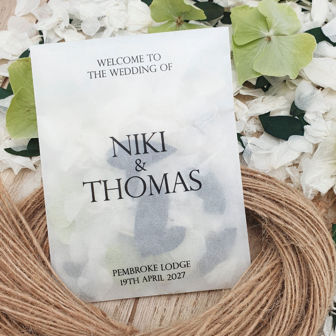 Wenn Sie auf der Suche nach einer unterhaltsamen und einzigartigen Möglichkeit sind, Ihrem Hochzeitstag noch mehr Spannung zu verleihen, probieren Sie doch mal unsere personalisierten Konfetti-Päckchen aus. Sie können aus einer großen Auswahl an Designs wählen, die zu Ihrem gewählten Konfetti passen, und wir können sogar Ihr eigenes Design drucken, wenn Sie etwas völlig Einzigartiges wünschen – schauen Sie sich unseren brandneuen Online-Paketdesigner an.