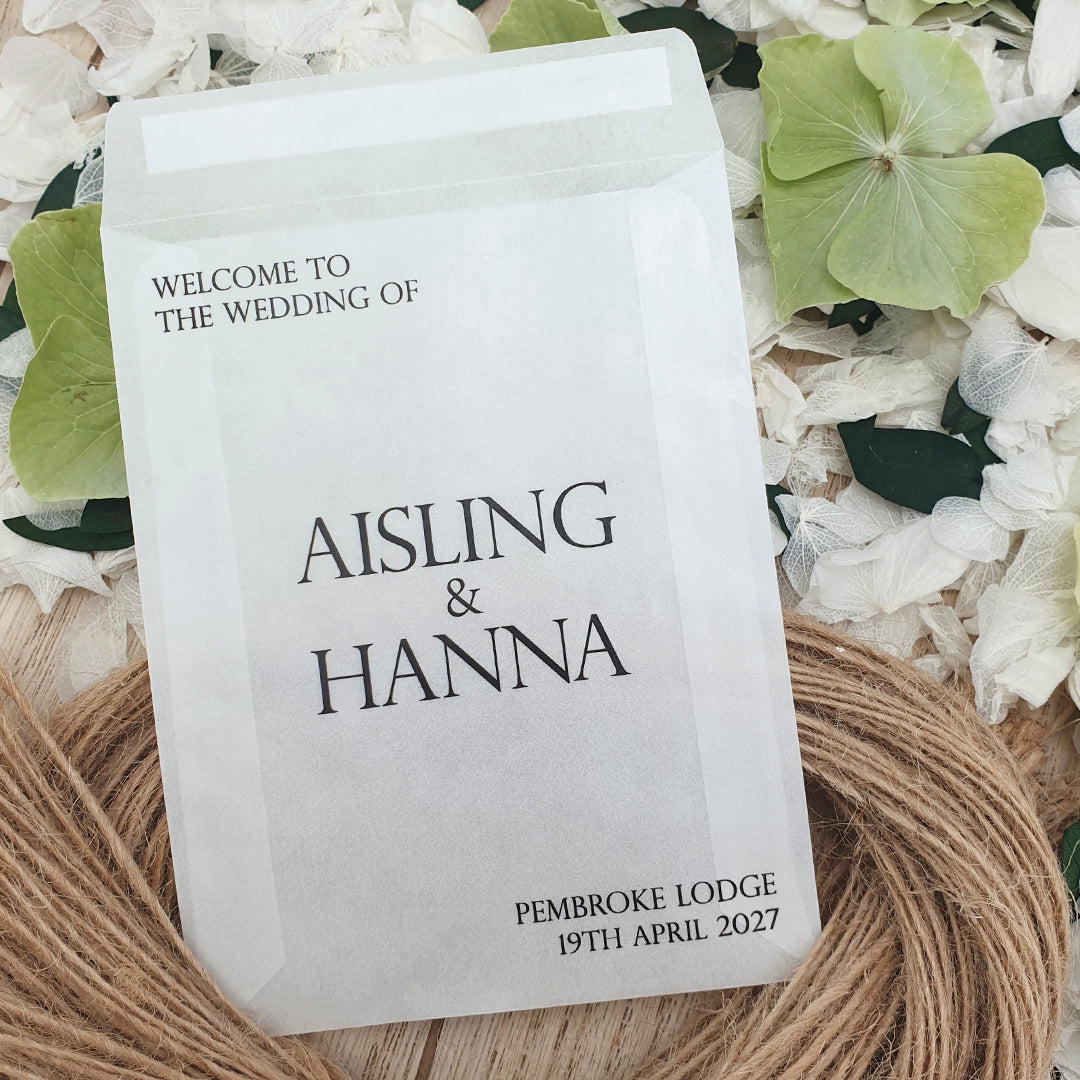 Wenn Sie auf der Suche nach einer unterhaltsamen und einzigartigen Möglichkeit sind, Ihrem Hochzeitstag noch mehr Spannung zu verleihen, probieren Sie doch mal unsere personalisierten Konfetti-Päckchen aus. Sie können aus einer großen Auswahl an Designs wählen, die zu Ihrem gewählten Konfetti passen, und wir können sogar Ihr eigenes Design drucken, wenn Sie etwas völlig Einzigartiges wünschen – schauen Sie sich unseren brandneuen Online-Paketdesigner an.