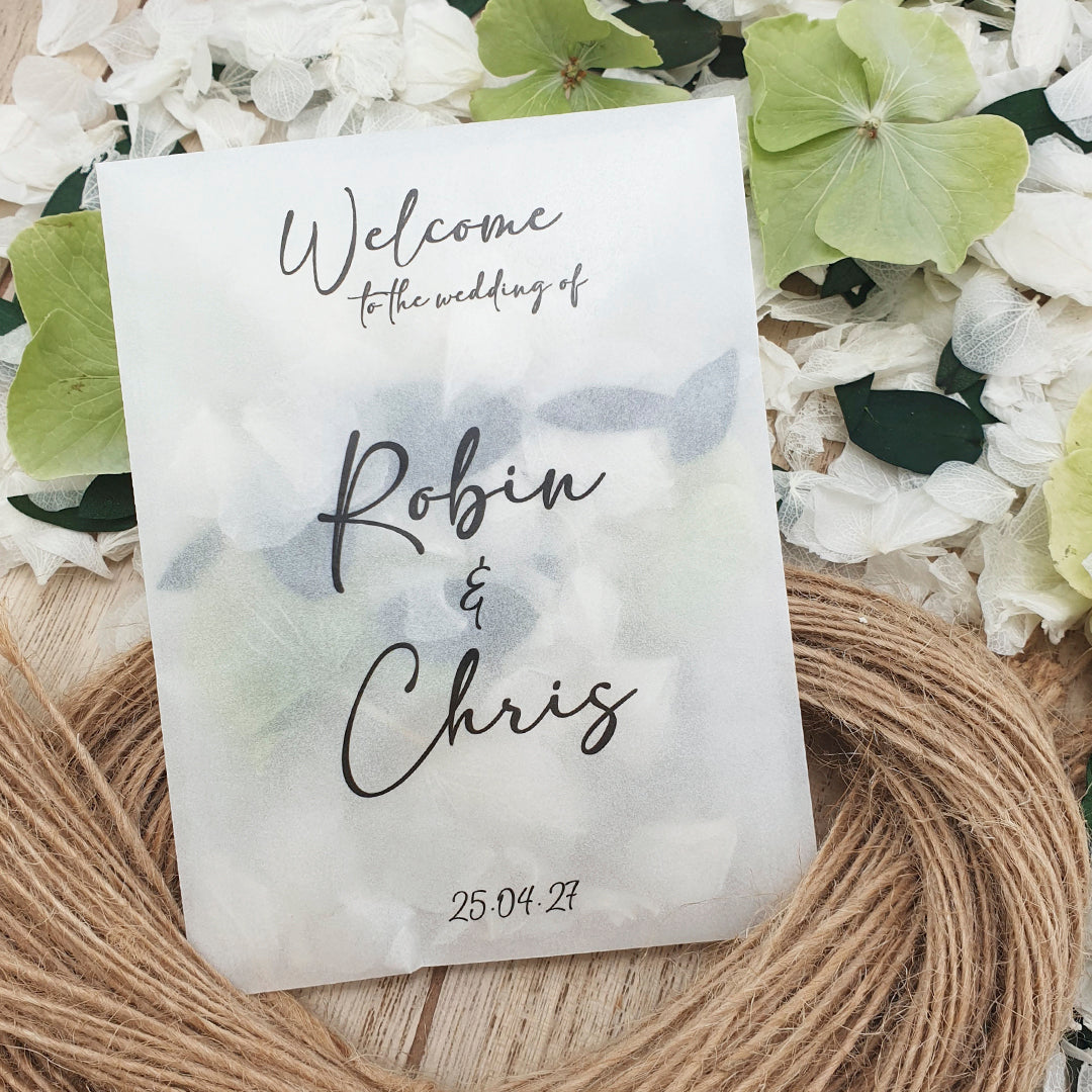 Personalisieren Sie dann Ihre Konfetti-Päckchen mit Ihren Namen und Ihrem Hochzeitsdatum Füllen Sie es mit dem von Ihnen gewählten Konfetti Ergänzen Sie wunderbar die Farbe und das Thema Ihres Hochzeitstags!