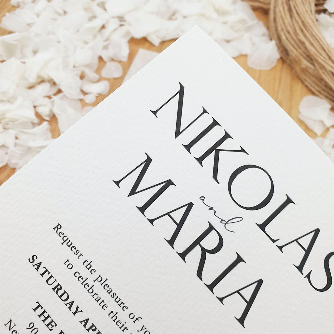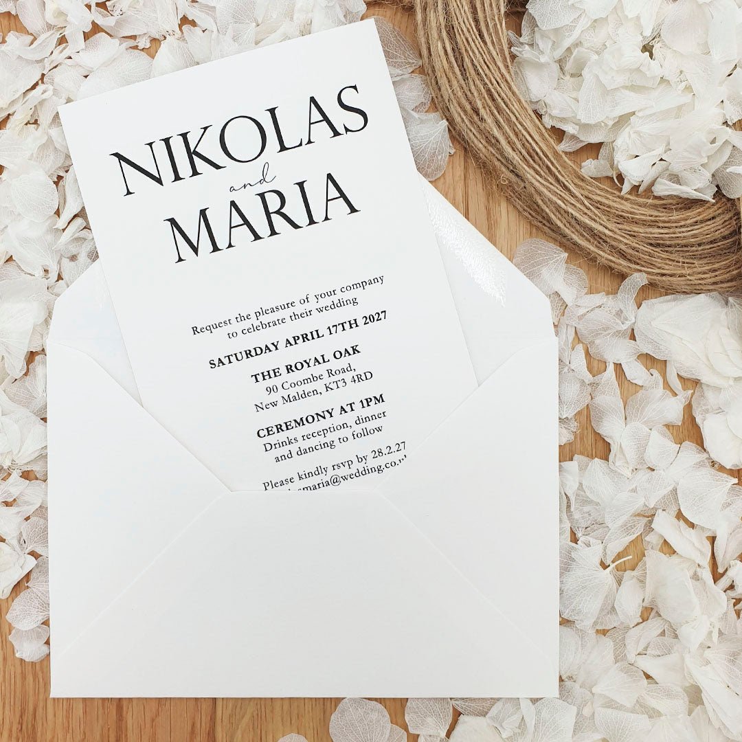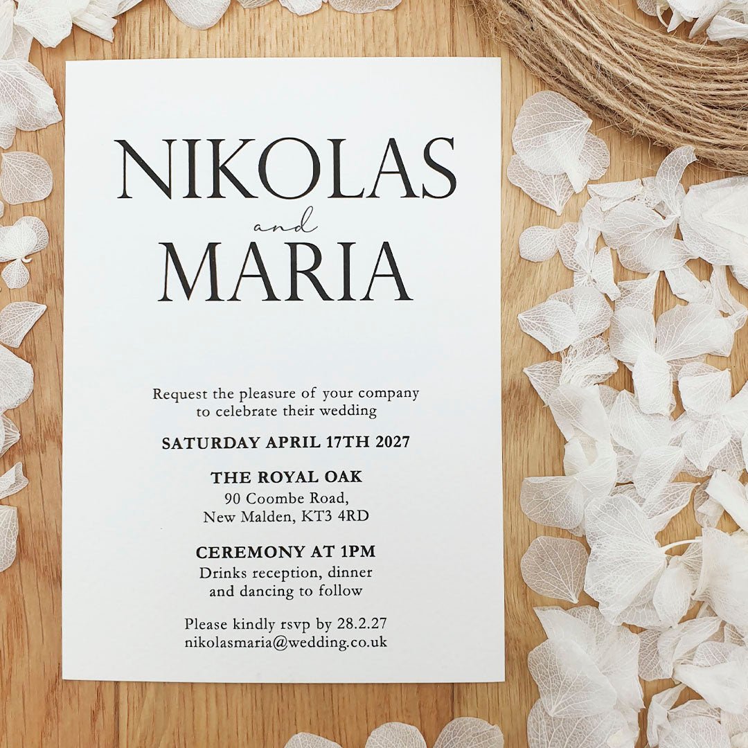 Make a timeless first impression with our personalised luxury wedding invitations in Classic Design 1, beautifully printed on recycled premium 320gsm felt white card for an elegant look and delightful tactile experience. Designed for couples who appreciate refined details, this invitation sets the tone for a truly special celebration.