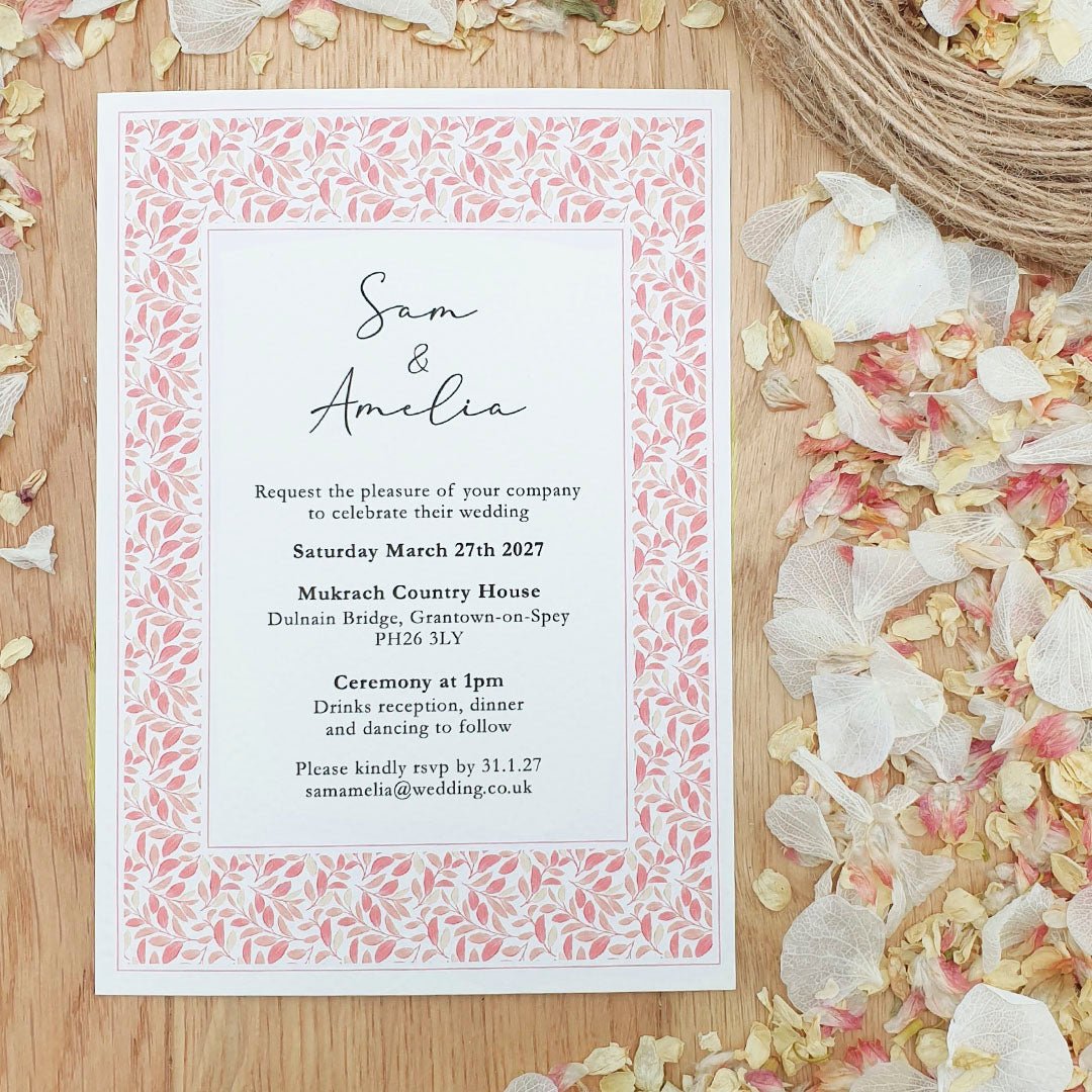 All of our wedding invitations are A6 in size, measuring 105mm x 148mm. They are printed on 320gsm recycled textured card, giving them a premium feel while remaining an eco-conscious choice.