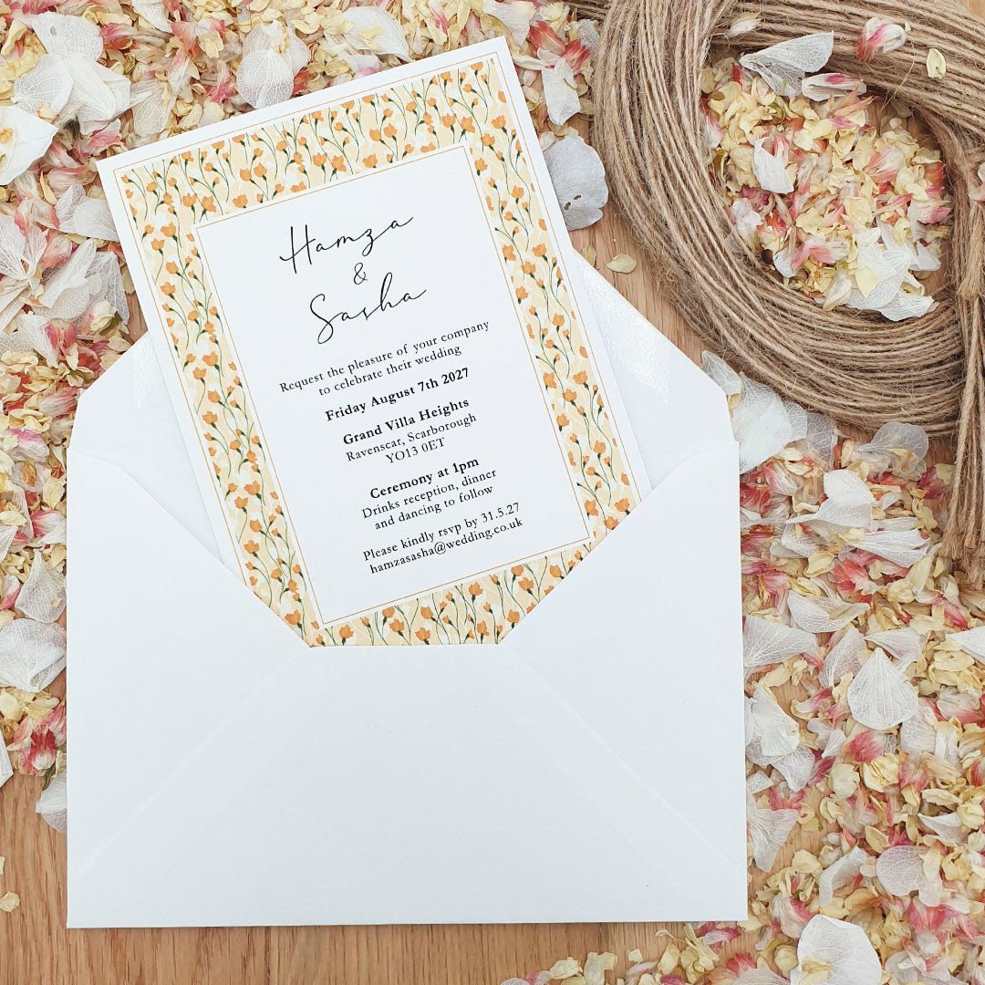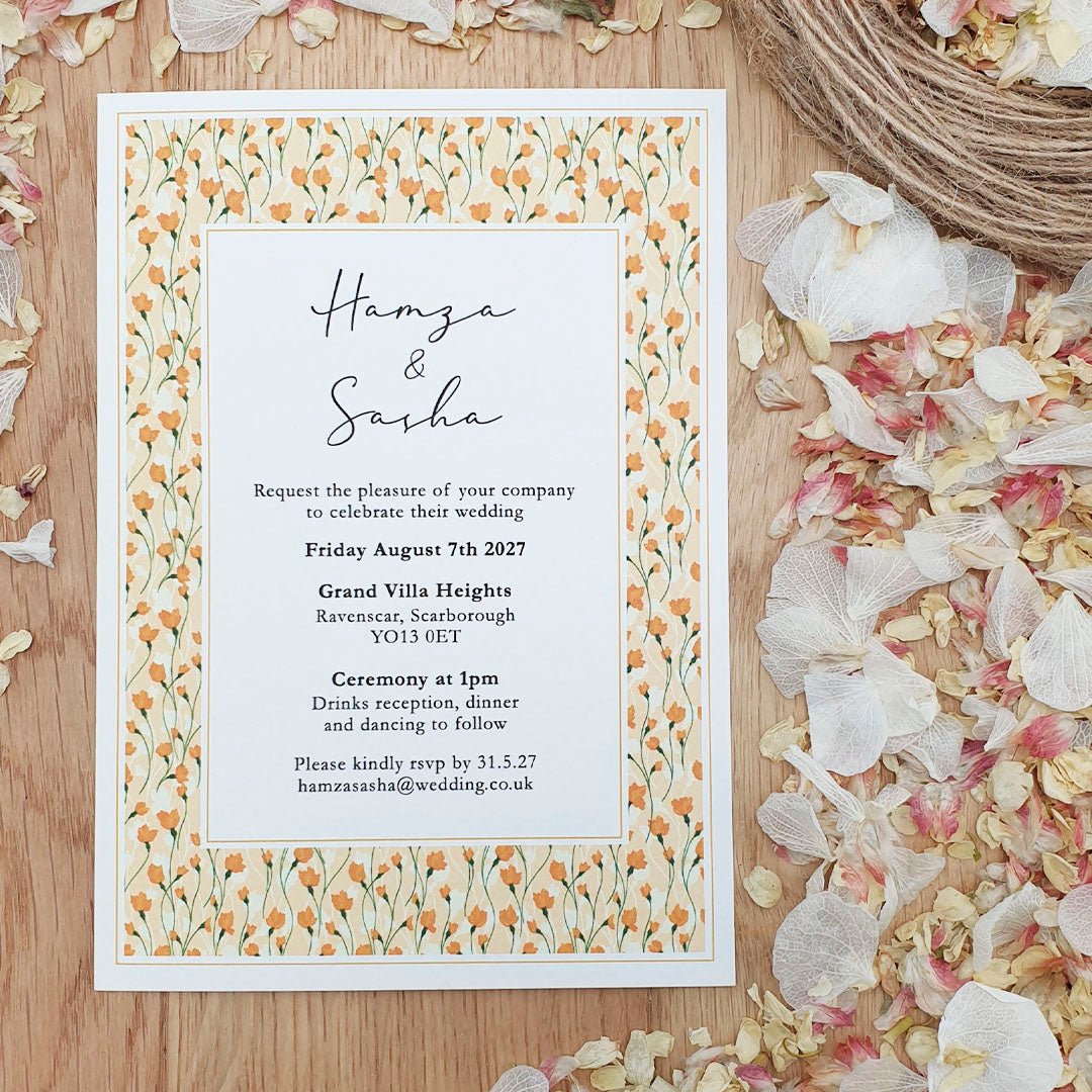 All of our wedding invitations are A6 in size, measuring 105mm x 148mm. They are printed on 320gsm recycled textured card, giving them a premium feel while remaining an eco-conscious choice.