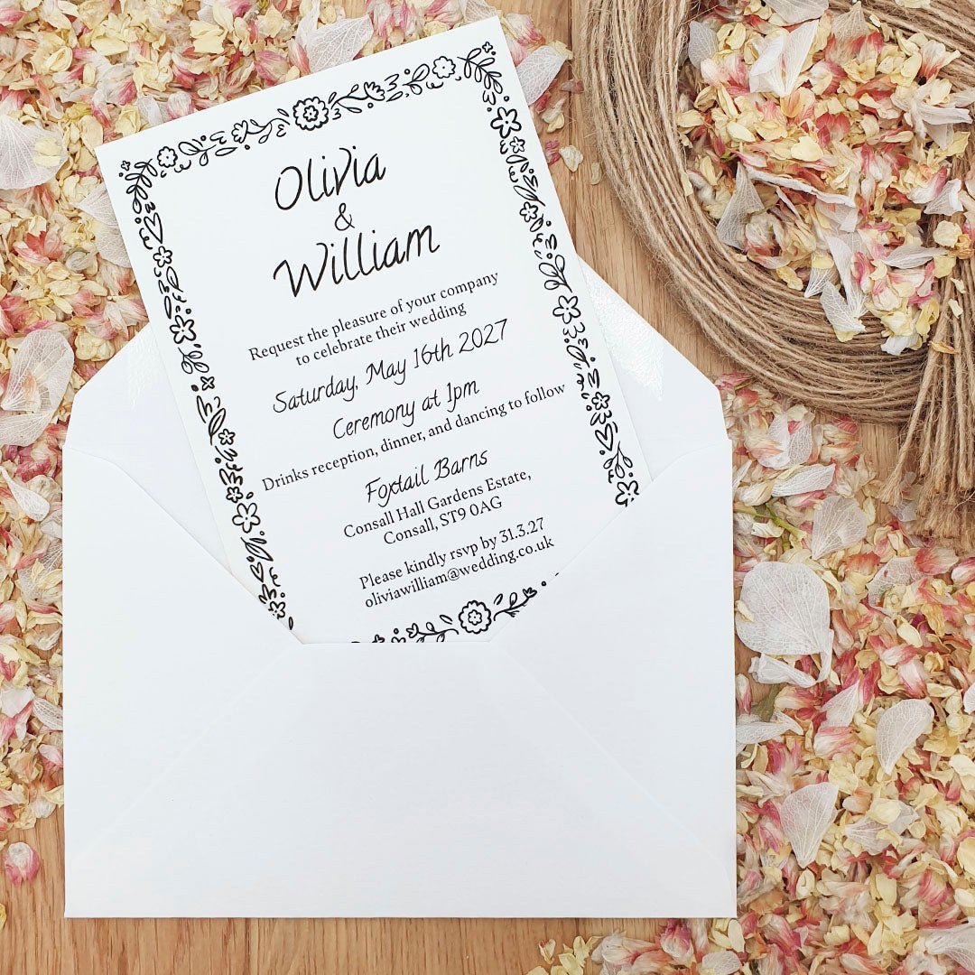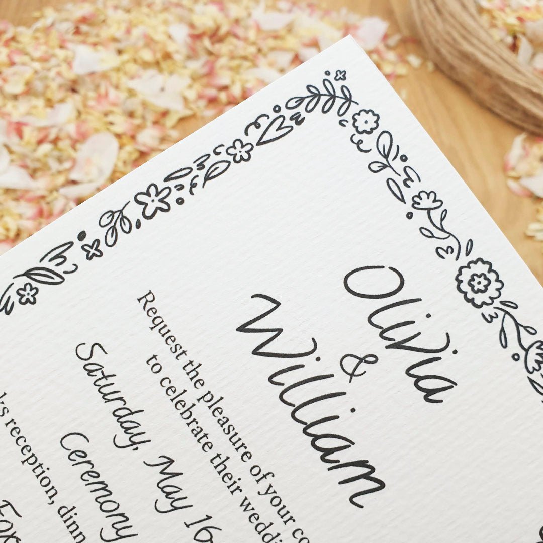 Make a timeless first impression with our personalised luxury wedding invitations in Floral Design 3, beautifully printed on recycled premium 320gsm felt white card for an elegant look and delightful tactile experience. Designed for couples who appreciate refined details, this invitation sets the tone for a truly special celebration.
