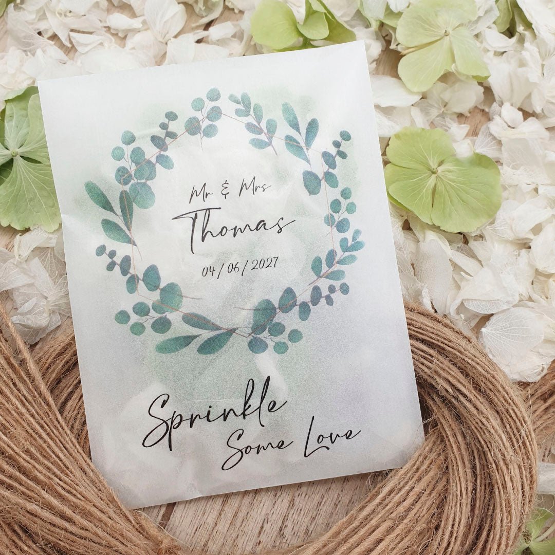 ¡Personalice sus paquetes de confeti con sus nombres y fecha de boda y luego llénelos con el confeti elegido para complementar maravillosamente el color y el tema del día de su boda!