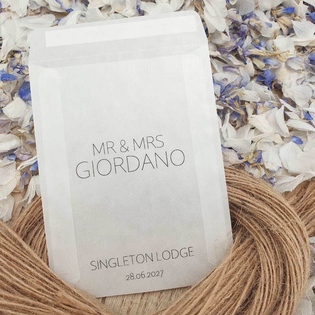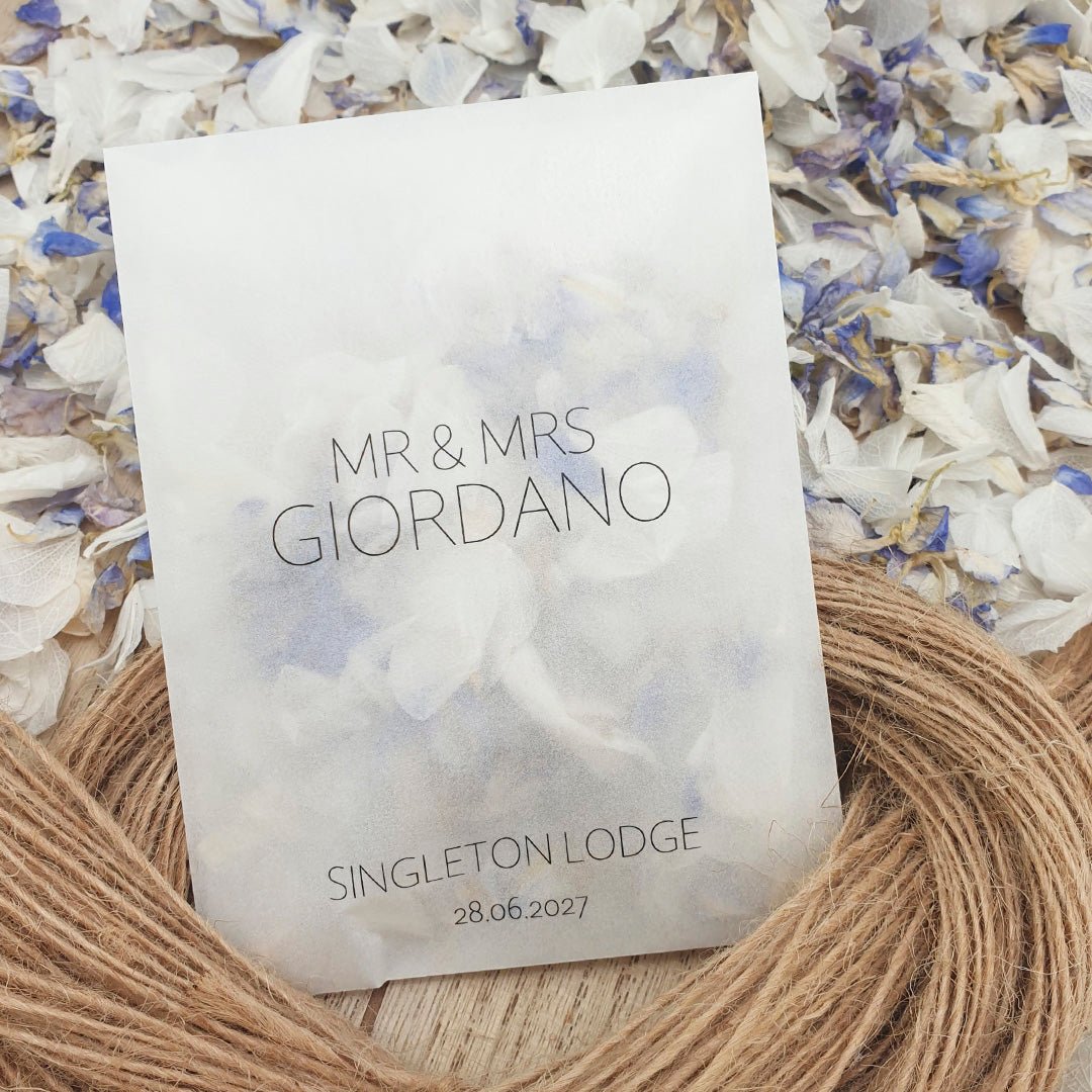 Personalice sus paquetes de confeti con su apellido de casado y fecha de boda y llénelos con el confeti elegido para ¡Complementa maravillosamente el color y el tema del día de tu boda!