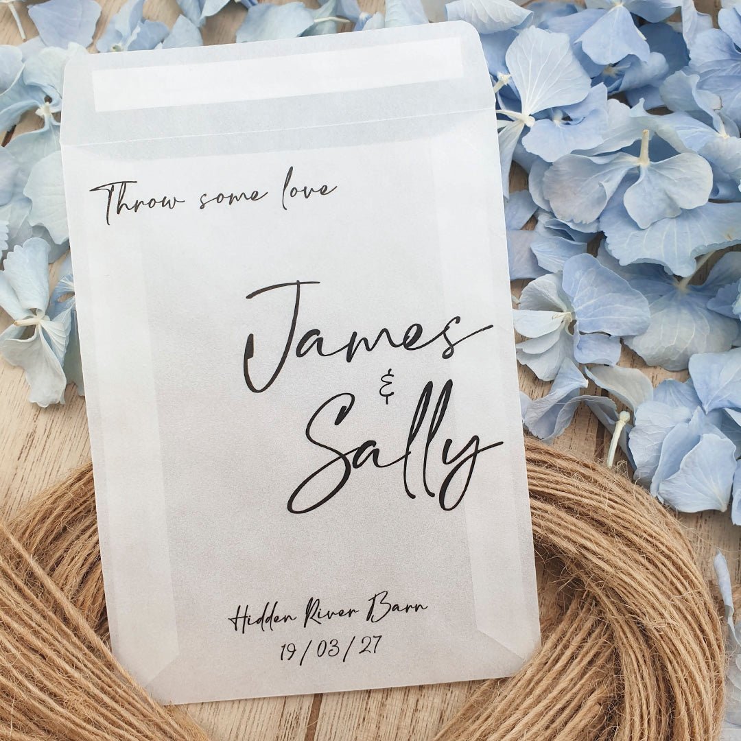 Personalice sus paquetes de confeti con sus nombres, fecha y lugar de la boda y llénelos con el confeti elegido para ¡Complementa maravillosamente el color y el tema del día de tu boda!
