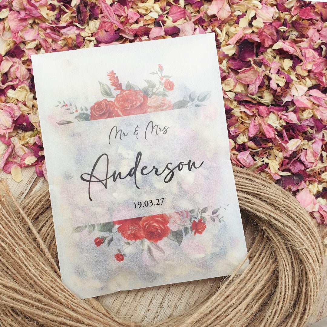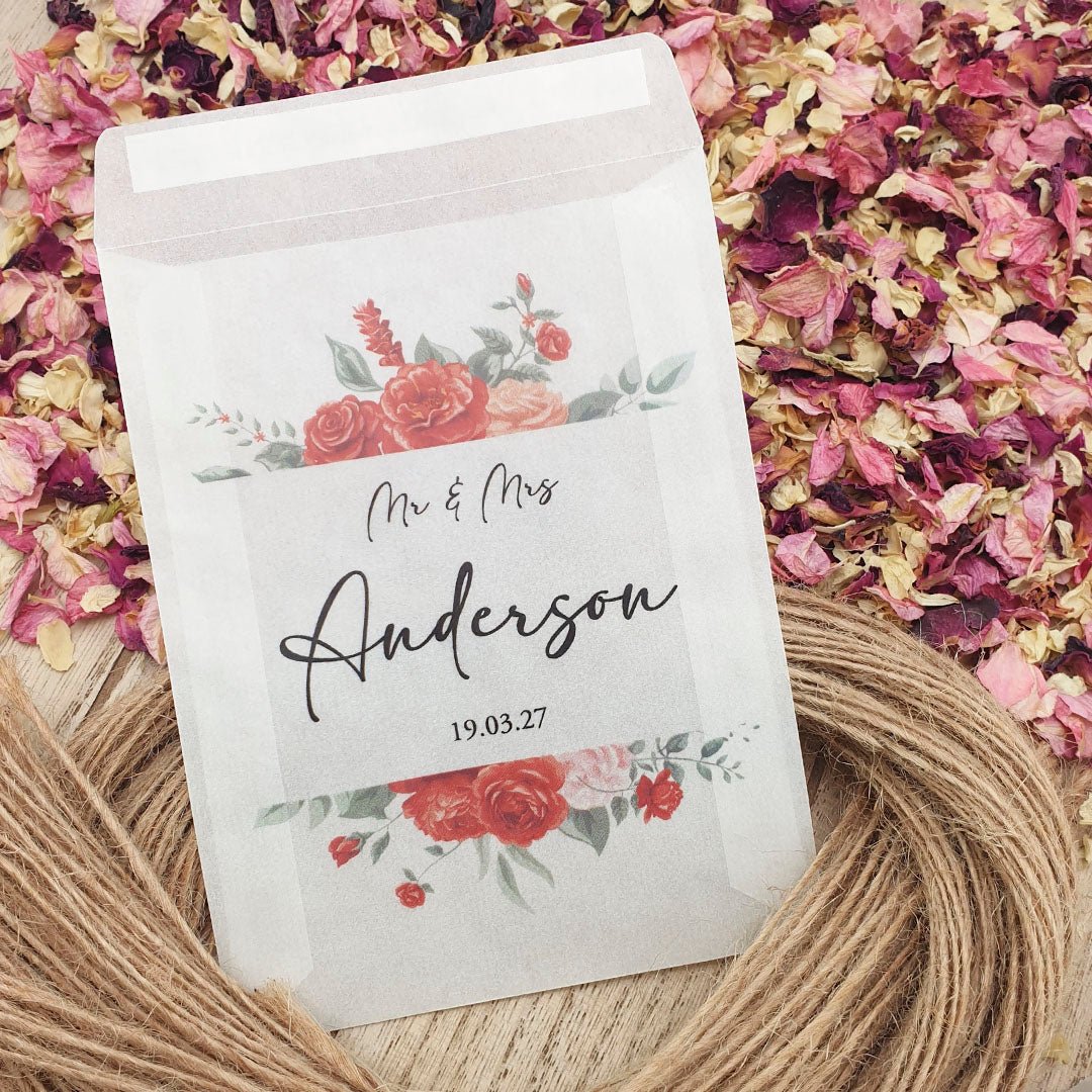 ¡Personalice sus paquetes de confeti con sus nombres y fecha de boda y luego llénelos con el confeti elegido para complementar maravillosamente el color y el tema del día de su boda!