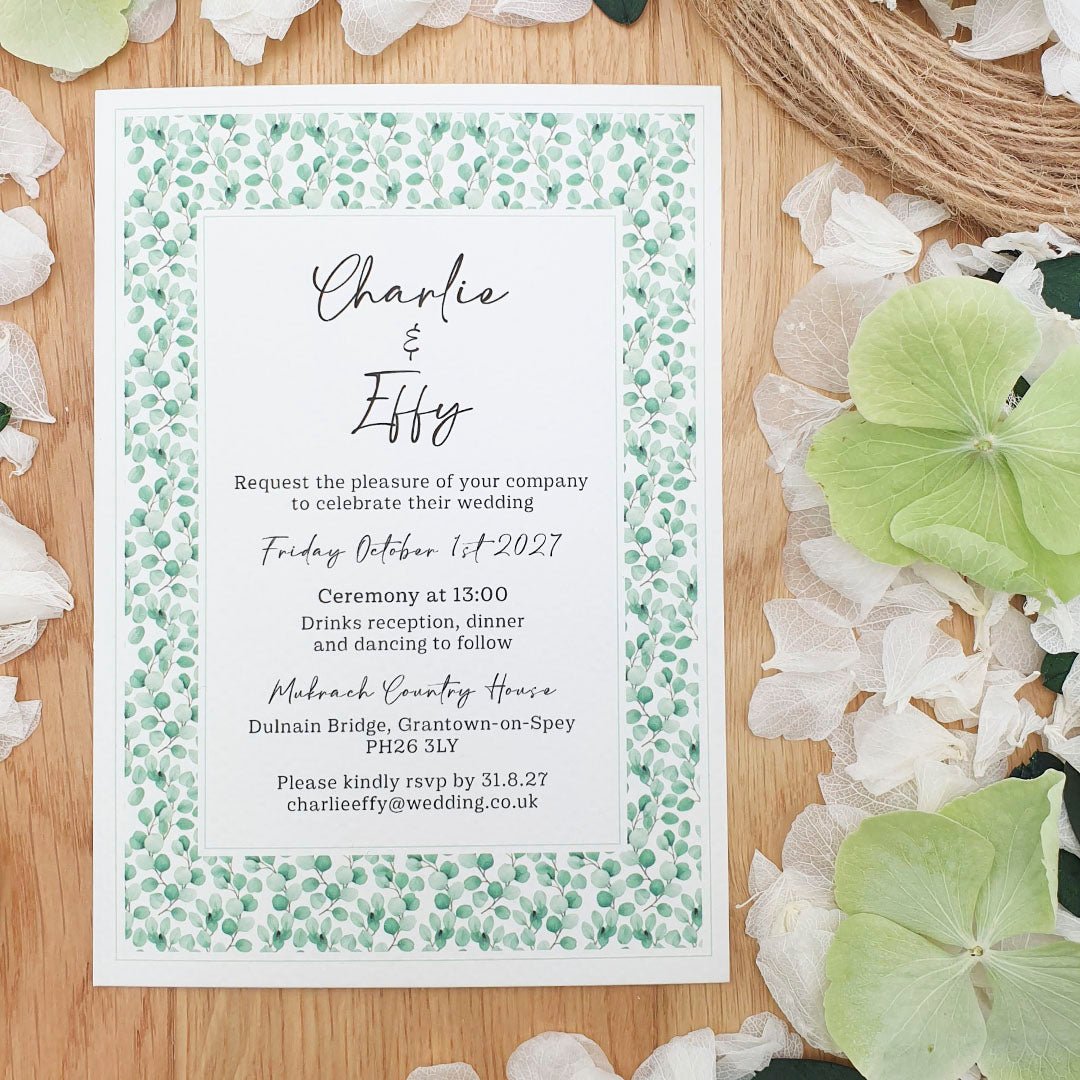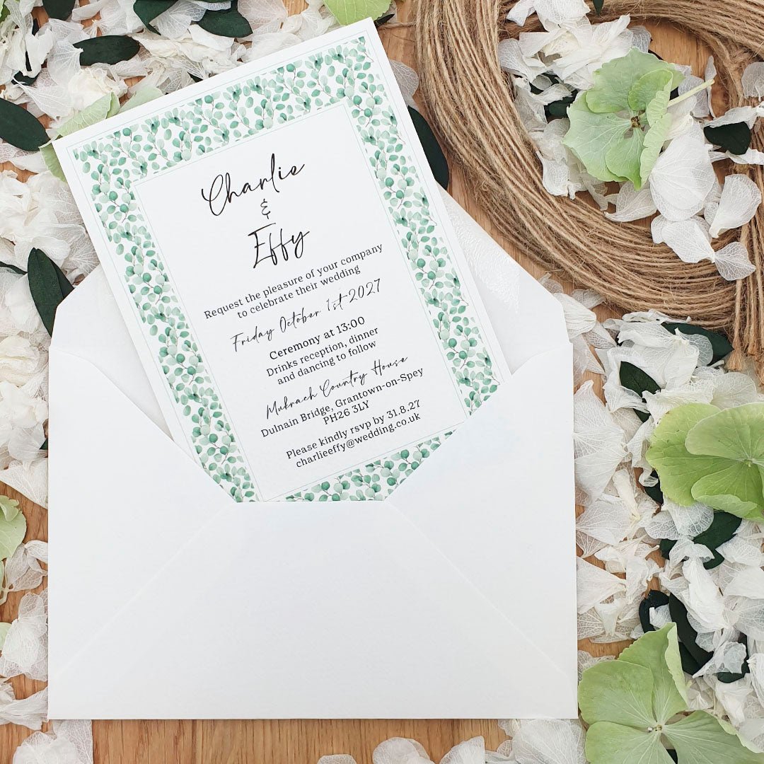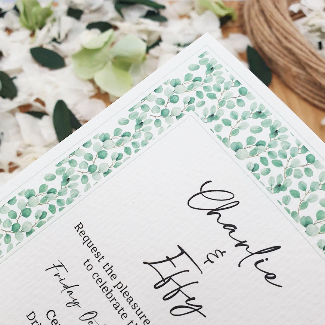 Make a timeless first impression with our personalised luxury wedding invitations in Eucalyptus Green Design 5, beautifully printed on recycled premium 320gsm felt white card for an elegant look and delightful tactile experience. Designed for couples who appreciate refined details, this invitation sets the tone for a truly special celebration.
