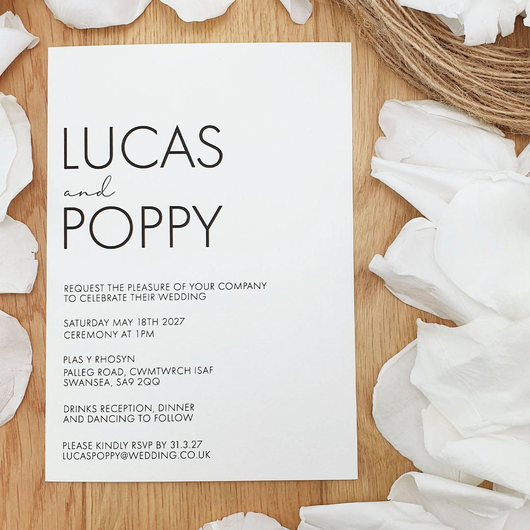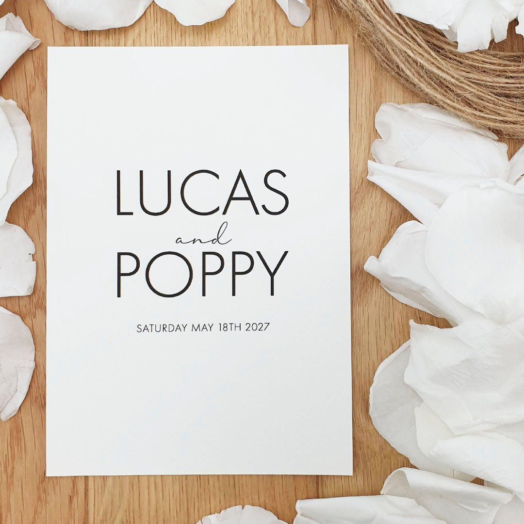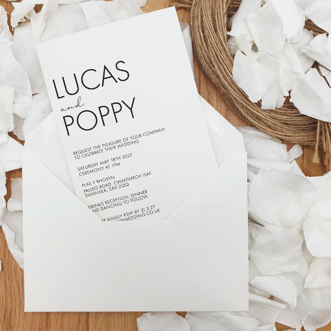 Make a timeless first impression with our personalised luxury wedding invitations in Minimal Design 1, beautifully printed on recycled premium 320gsm felt white card for an elegant look and delightful tactile experience. Designed for couples who appreciate refined details, this invitation sets the tone for a truly special celebration.