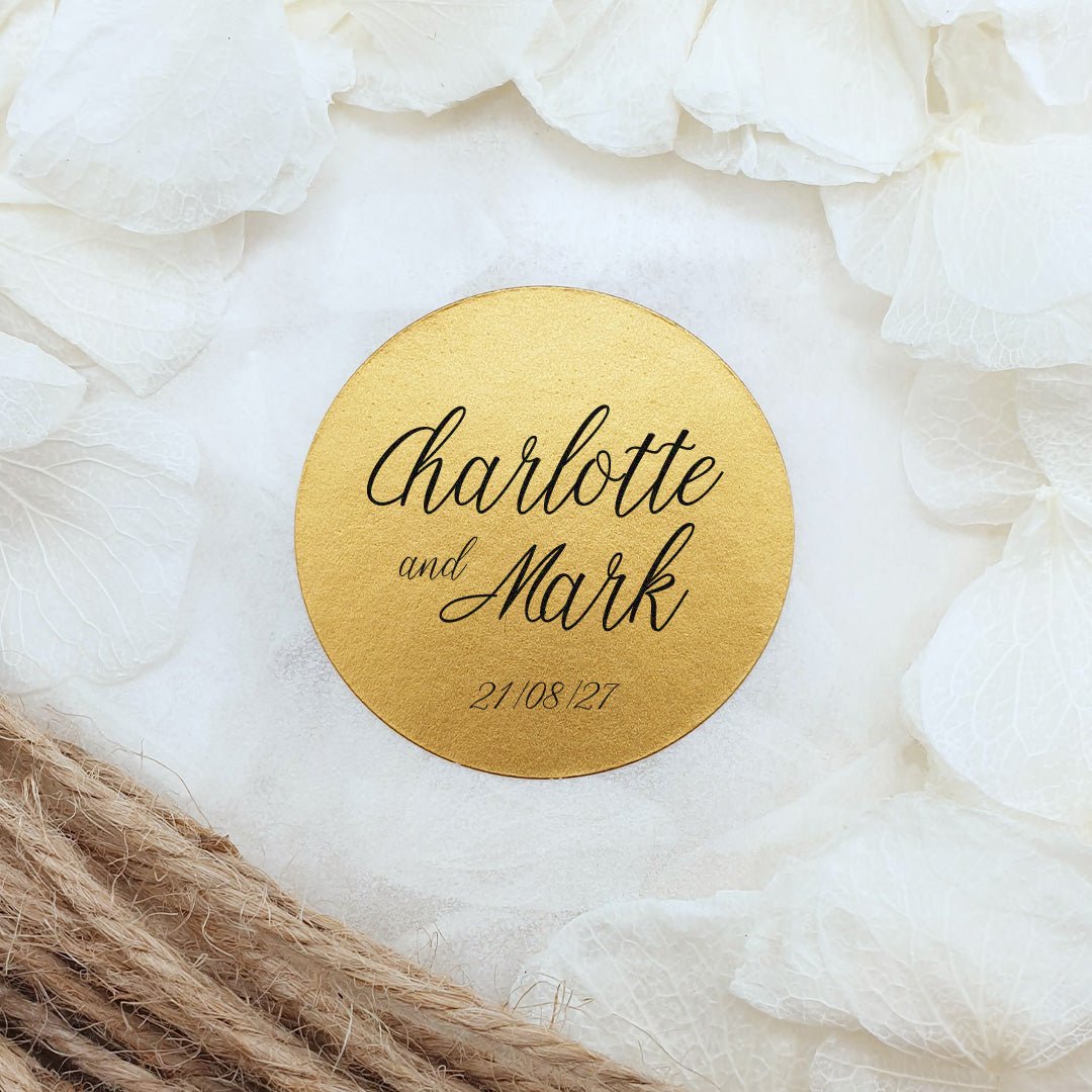 Personalícelo con sus nombres y fecha de boda y adjunte al paquete de confeti elegido para coordinar con el color y el tema del día de su boda.