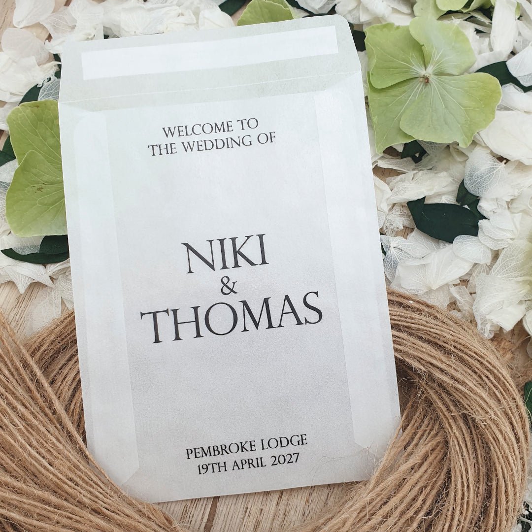 Personalise your confetti packets with your names & wedding date then fill with your chosen confetti to beautifully complement the colour and theme of your Wedding Day!